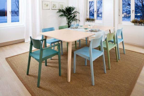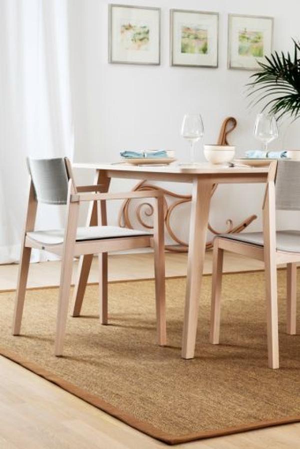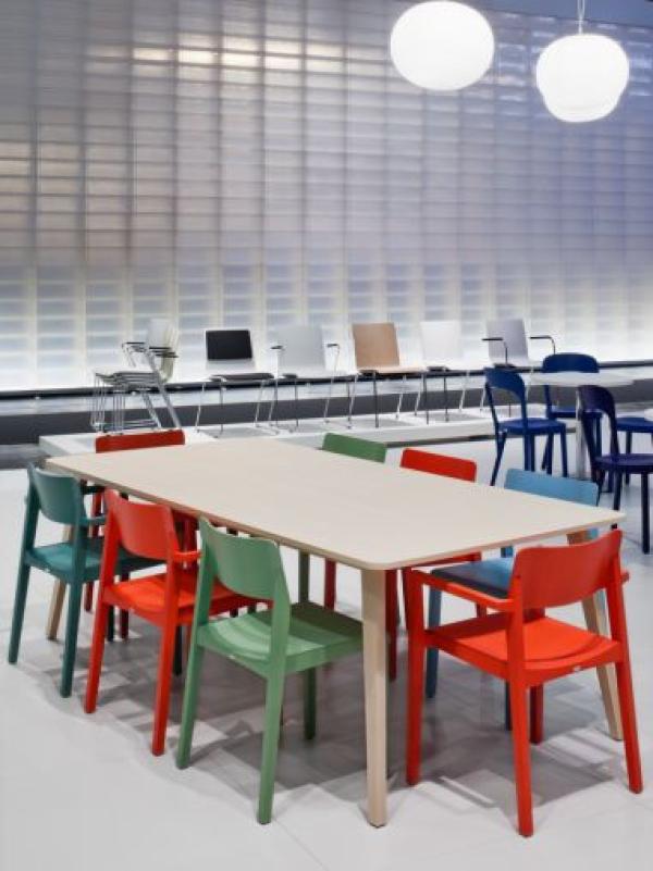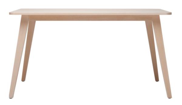 1330"ESSENTIAL FORMS The 1330 tables' design language matches that of the 330 chair: it is also defined by straight lines and functionality. The rectangular, solid-wood legs are tapered and slightly splayed. The veneered tabletop sits on a frame and features beveled edges. The tabletop itself seems to float above its supporting frame, which is bowed inwards along its front edge. Tables rectangular in diverse dimensions." |
