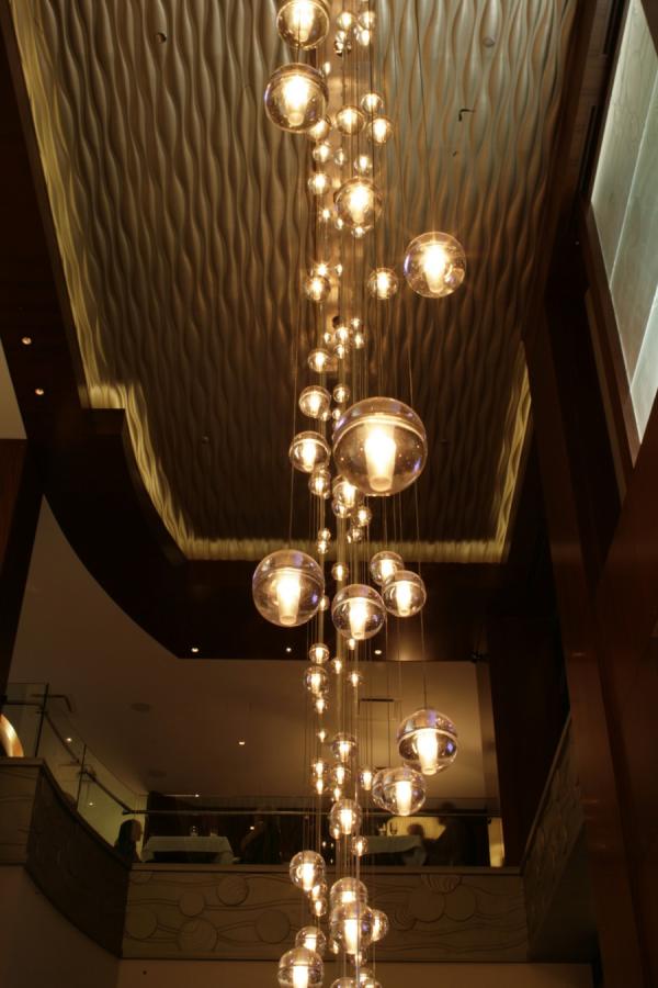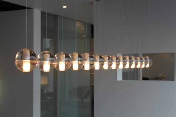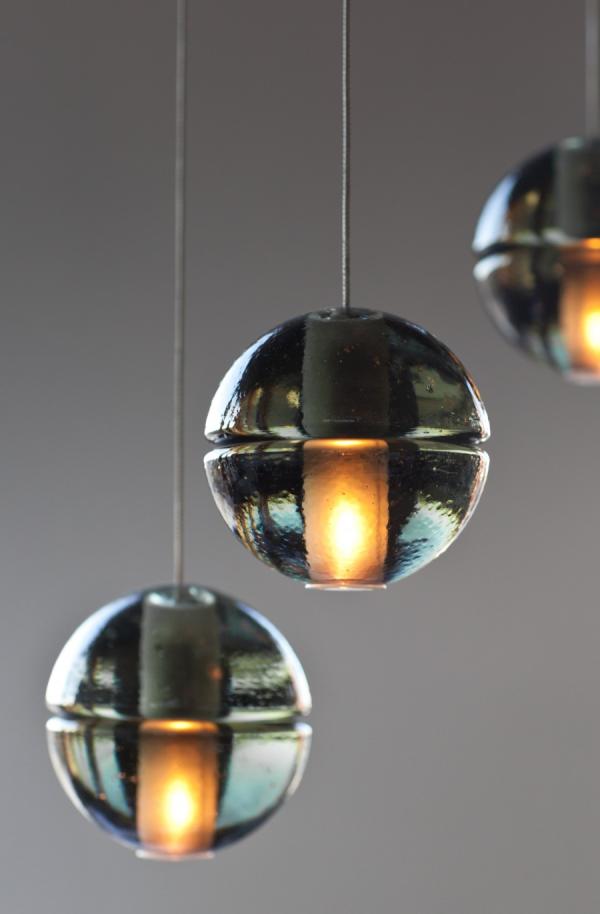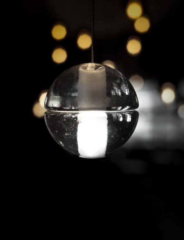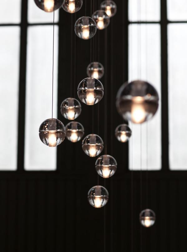 14"Traditionally, chandeliers have been understood as central, sculptural installations, which become the visual focus of a room. The 14 series, designed by Omer Arbel in 2005, is the original chandelier to challenge this concept. Instead of a central sculptural object, the 14 series is an ambient chandelier, achieving its power through a strategy of composition and clustering. The 14 series fills the volume of a room, making the height and shape of its dimensions understood to the inhabitants in a direct physical manner. The 14 series pendant is an articulated, seamed cast glass sphere with a frosted cylindrical void that houses either a low voltage (12V, 10Watt xenon) or proprietary and replaceable LED. Individual pendants are visually quite subtle, but gain tremendous strength when multiplied and clustered in large groups. Light interacts with the bubbles and imperfections of the cast glass to produce a glow reminiscent of small candles floating within spheres of water. Cast glass is an organic process, imperfect by nature, and each 14 series pendant is handmade; thus, every piece produced is unique. Our standard collection offers flexibility in both design and measure, starting from a single pendant and continuing through to 36 pendant chandeliers in a range of canopy shapes and sizes. The clustering effect can be manipulated through various combinations to create larger scale groupings with profound phenomenological impact."