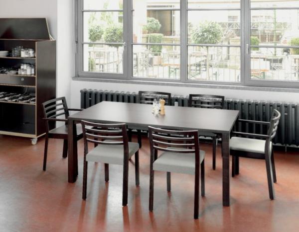 480"BEAUTIFULLY DESIGNED AND AVAILABLE IN MANY VERSIONS Beautifully designed and available in many versions. The chairs of program 480 perfectly harmonize classic Thonet material quality with clearly defined functionality. Solid beech wood is their material; their form is harmonically proportioned and ergonomic. Seat, backrest and armrests assure comfortable sitting. The chairs are robust and easy to care for; chairs with or without armrests can be stacked together, and they can be connected via an add-on element. With a variety of versions, they fit into a wide range of environments and spatial concepts, whether in public areas or private homes.