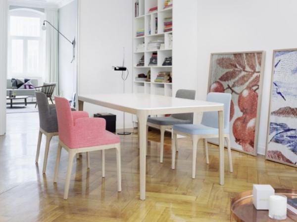 580"PURE ELEGANCE: THE 580 CHAIR SERIES Purist and elegant. The new chair program is especially fit for the living and dining segment. The one-piece backrest and narrow upholstered seat shell mounted flush on the four-leg frame with its delicate legs curved to the inside are characteristic for this model. The upholstered seat shell with integrated spring support offers high comfort. The program consists of chairs without armrests and slightly wider armchairs with one-piece, beautifully designed armrests.
