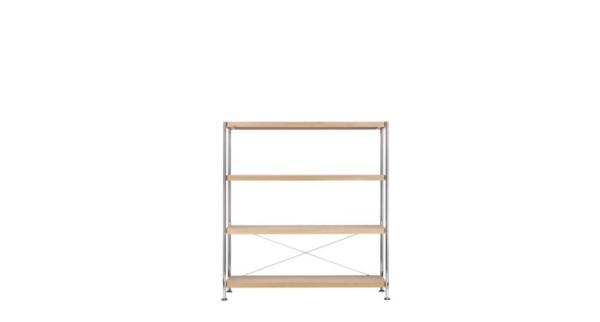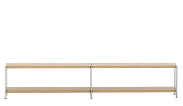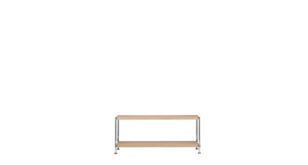 7000"MODULAR, MINIMAL, INDIVIDUAL: THE NEW 7000 SHELVING SYSTEM Elegant, simple, and modular: shelf system 7000 has a basic grid of 140, 120 or 80 cm width, 10, 20, 30 or 40 cm height, and is 40 cm deep. It can be assembled without tools and extended or changed in its dimensions with additional elements. Various surfaces offer a broad spectrum of uses from the living to the contract segment. The contrast between the 4 cm thick shelves and the clear, reduced metal support structure is aesthetically attractive. Aluminum support structure high-gloss polished, chrome-plated matte or powder-coated black or white. Shelves made of lightweight wood panel, veneered in beech, ash, oak or nut wood or in different stains; top coat in black and white or laminate in white and light gray with plastic edge veneer.