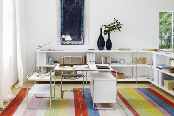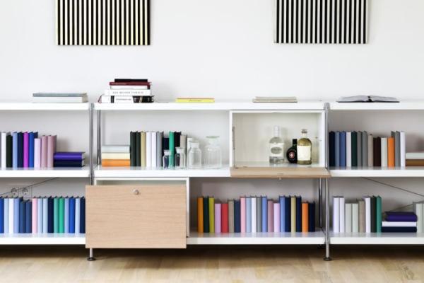 The shelf can be extended or complemented with various elements: Corner solution. Shelves at 90° angle. Cabinet elements. With front flap or drawer and one shelf, upon request available as suspension file drawer, equipped with recessed grip or safety lock. Bookends. They can be simply clicked into the frame at any time." |