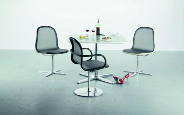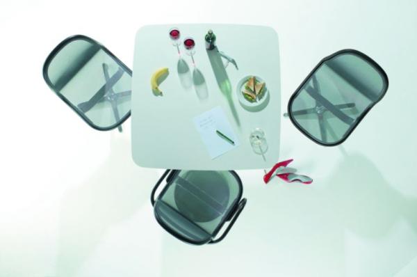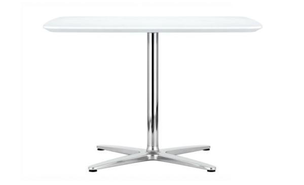 A 1660"ORGANIC IN ITS SHAPE, WELL-PROPORTIONED AND REDUCED TO A MINIMUM Organic in its shape, well-proportioned and reduced to a minimum. The details make this table something special. The exciting contrast between wood and metal, the elegantly curved lines of the tabletops, and the edges of the tabletop that are beveled towards the bottom make the table look lightweight and clear. With their diverse forms and dimensions and the broad selection of tabletop surfaces they can be used in many ways: in homes, restaurants and cafés, as well as meeting rooms. Single-column table with round or square tabletops, in diverse dimensions. Star base in polished aluminium, chrome-plated steel column. Tabletops veneered in beech, maple, ash, black cherry, nut, and oak or with clear varnish." |
