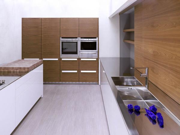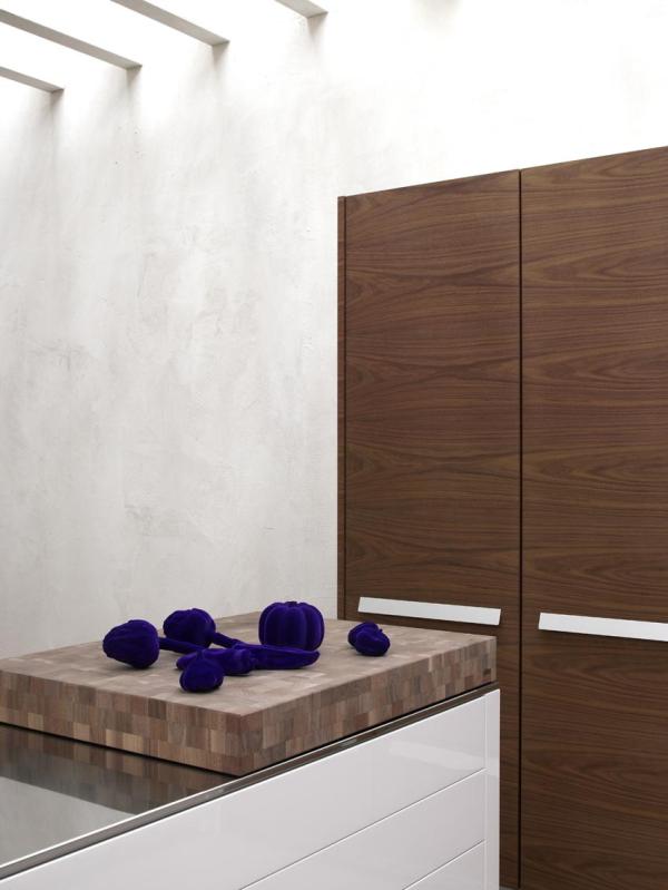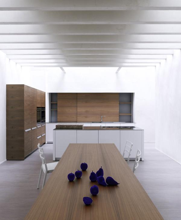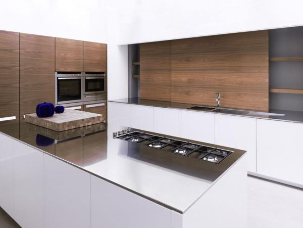ACOX_3Selected materials, genuine and true: natural Walnut wood with continuous vein, stainless steel, glossy lacquer, aluminium. A suitable kitchen, intended as a place where meeting means conveying and not only cooking. The island dimensioned for storage and cooking, base unit area for washing and differentiated waste collection, concealable larder unit with sliding doors, tall units with built-in warm and cold appliances. The goal: a smooth comfortableness, a proper space arrangement. |