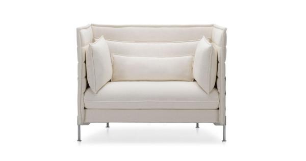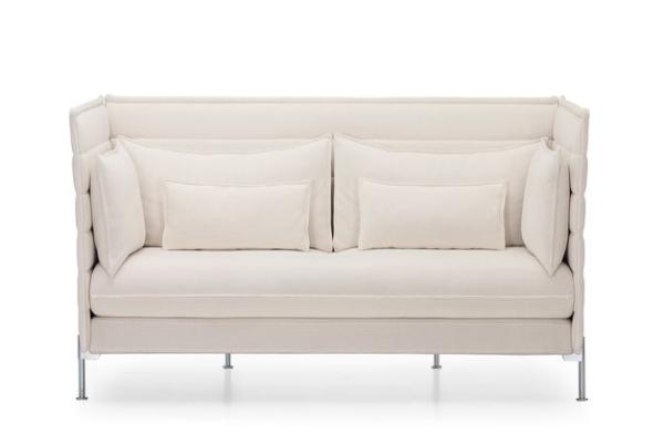 Alcove Highback SofaThe central idea behind the Alcove Sofa is that a sofa can be much more than just a piece of furniture. This is especially true of the Alcove Highback Sofa, whose side and back panels reach an exceptional height. When someone sits down on the Alcove Highback, they find themselves in a secluded space. Thanks to the outstanding acoustic qualities of the Alcove Highback Sofa and its function as a visual screen, it creates a peaceful oasis — especially in spacious living areas. This effect is even more pronounced when two sofas are positioned face to face, thereby defining a room within a room. Materials: Chromed tubular steel, metal frame with belt upholstery, panels made of fibreglass-reinforced plastic, seat and backrest cushioning: polyurethane foam and polyester wool, set of cushions: filled with microfibres and polyurethane foam.