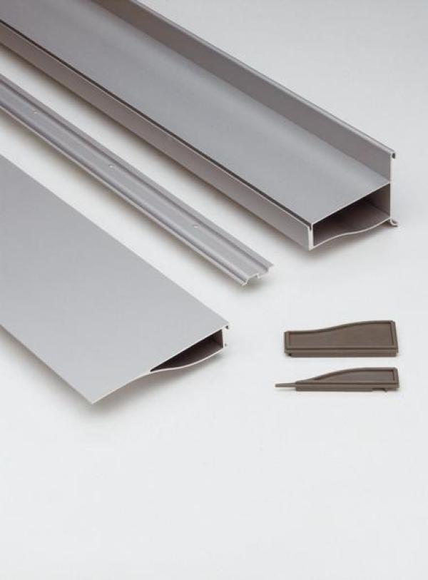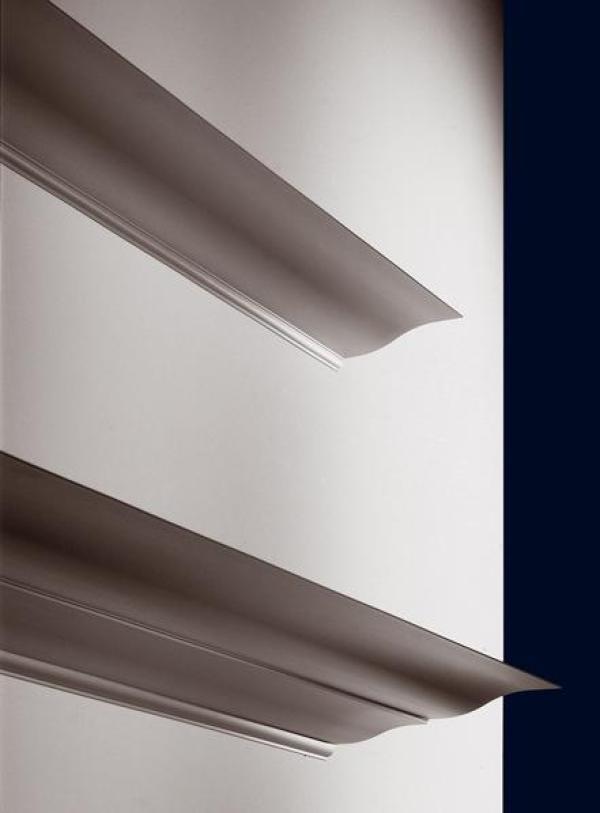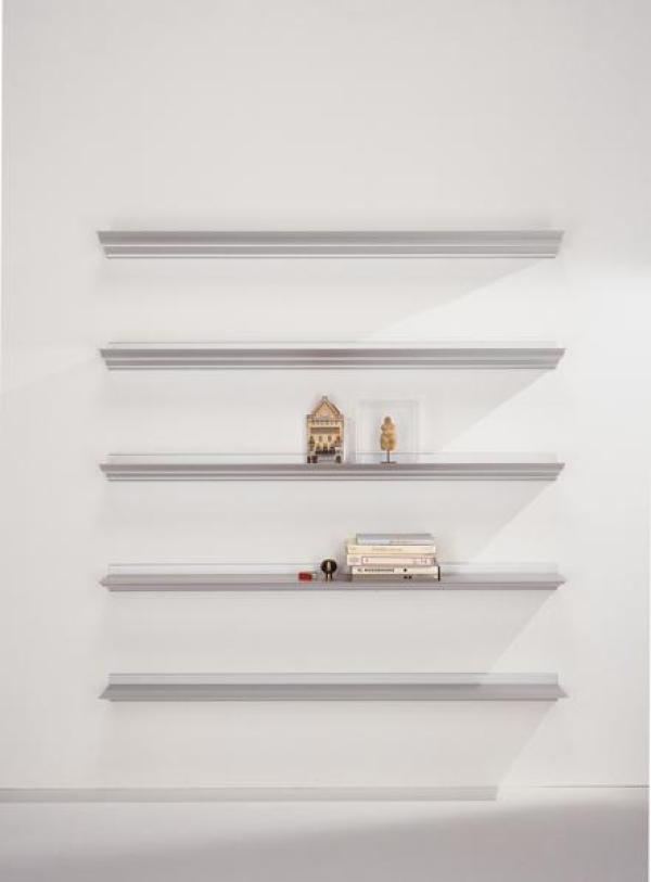 Aluminium shelving CornisaThe wittily postmodern accents of the Hialina shelving are continued here, in this excellent example of the application of a material and modern manufacturing technique, that of extruded aluminium, to a historicist and decorative element. Support and shelves in anodised matt silver aluminium hung to the wall. Grey side plugs are optional. Launch : 1988
