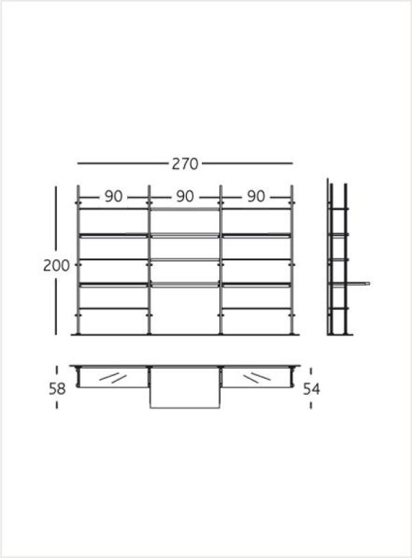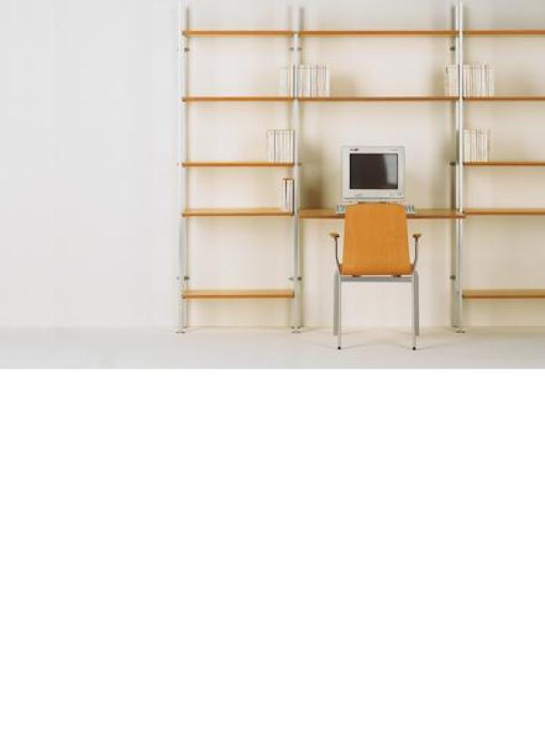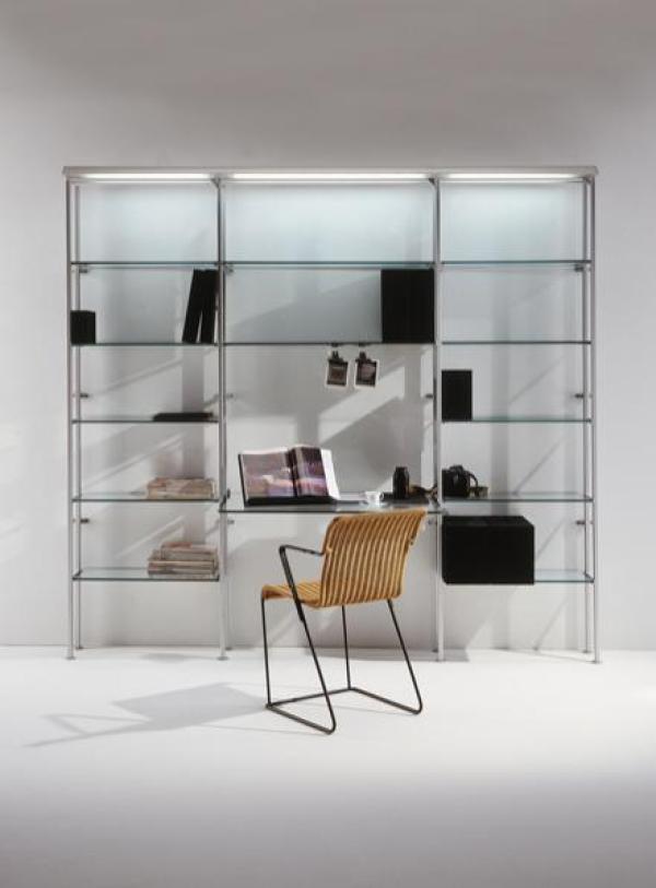 Aluminium shelving CristalinaTwo supports fixed perpendicularly on the wall make it possible to have very deep shelves. Consequently, they can hold not only books but music systems, TVs, computers, etc. and can even become a small workspace. Launch : 1998 Dimension : WIDTH 2700 x DEPTH 580 x HEIGHT 2000mm |