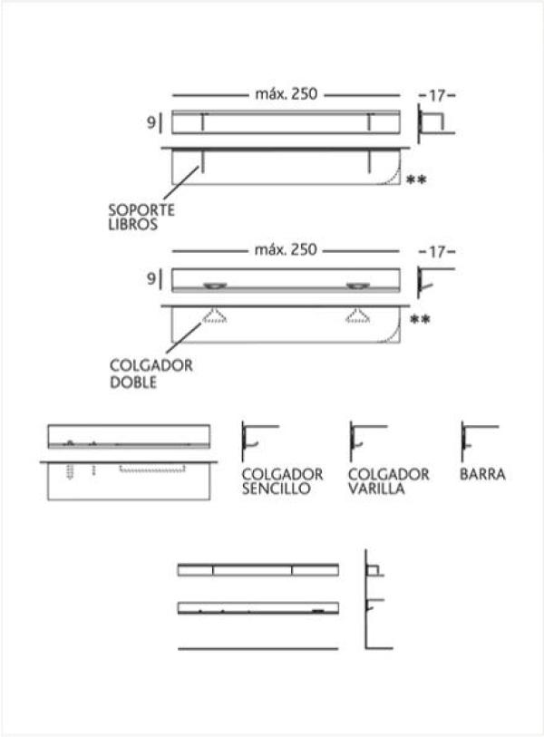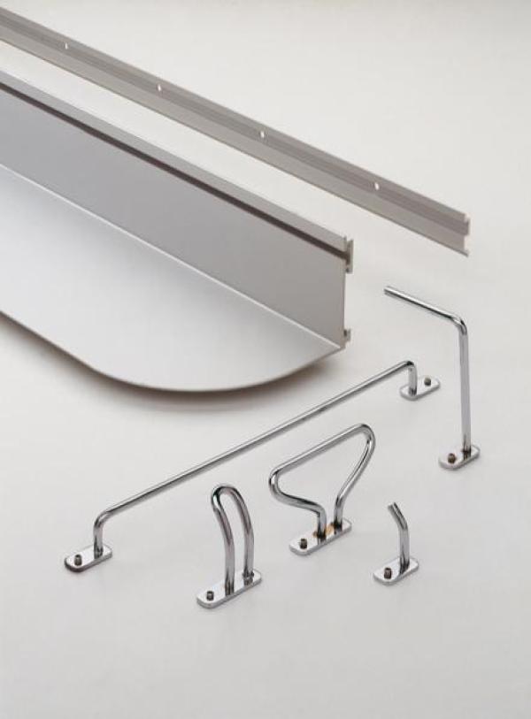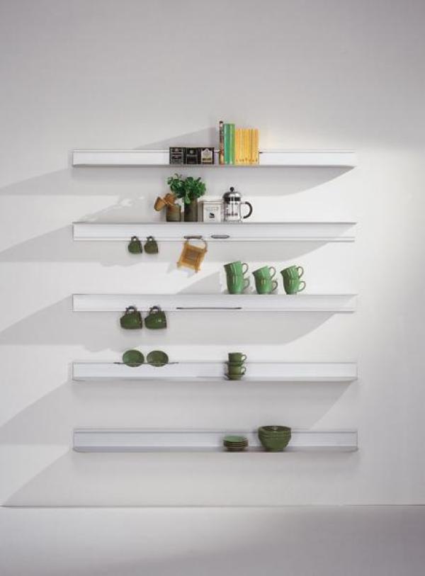 Aluminium shelving PhantasmaPete Sans gets the most out of an extruded aluminium shelf: two positions, up to 3 metres long and a complete range of accessories. Shelf and profile in anodised matt silver aluminium hung to the wall. Accessories in chromed brass. Launch : 1995 Dimension : WIIDTH 2500 x DEPTH 170 x HEIGHT 90mm |