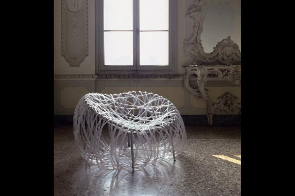 AnemoneSpecial hollow tubes in plastic are hand woven methodically and screw-attached to the corolla-shaped frame lacquered in a metallic grey colour. The weave, which may seem random, forms a comfortable and attractive seat. The tubes are available transparent or in various colours. Launch : 2001 Dimensions : w1200 x d900 x h660mm |