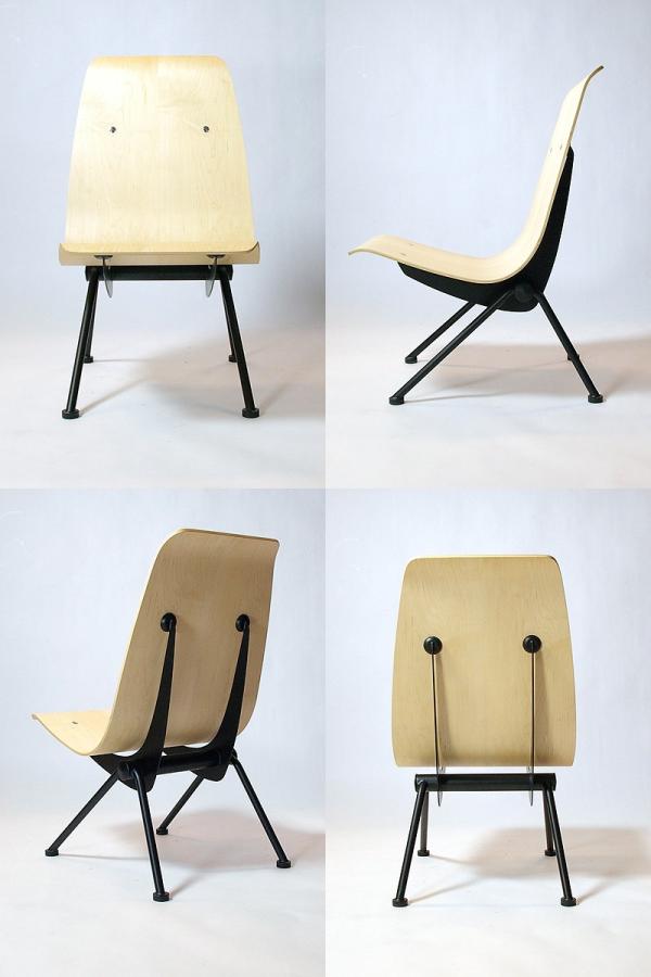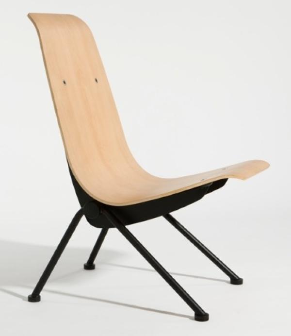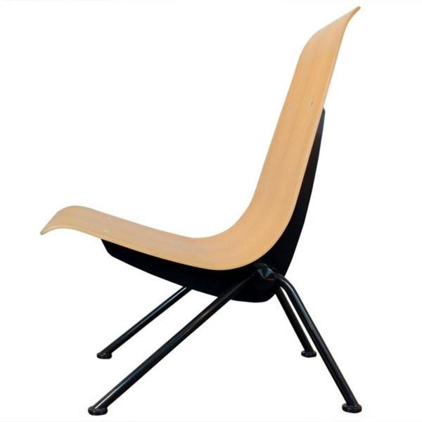AntonyDesigned at the beginning of the 1950s for the cité universitaire at Antony, near Paris, this chair was one of Prouvé's last efforts in the field of furniture design. The salient feature of this unique item of seating furniture is its unconventional construction, which Prouvé successfully combined with a strikingly dynamic shape. Materials: Frame made of lacquered sheet and tubular steel, seat shell made of moulded wood, oak veneer with natural wood look.