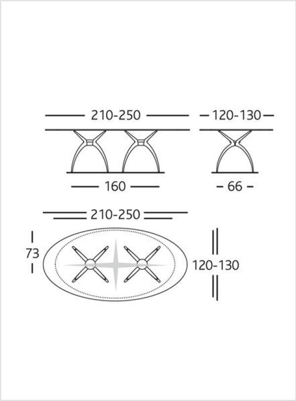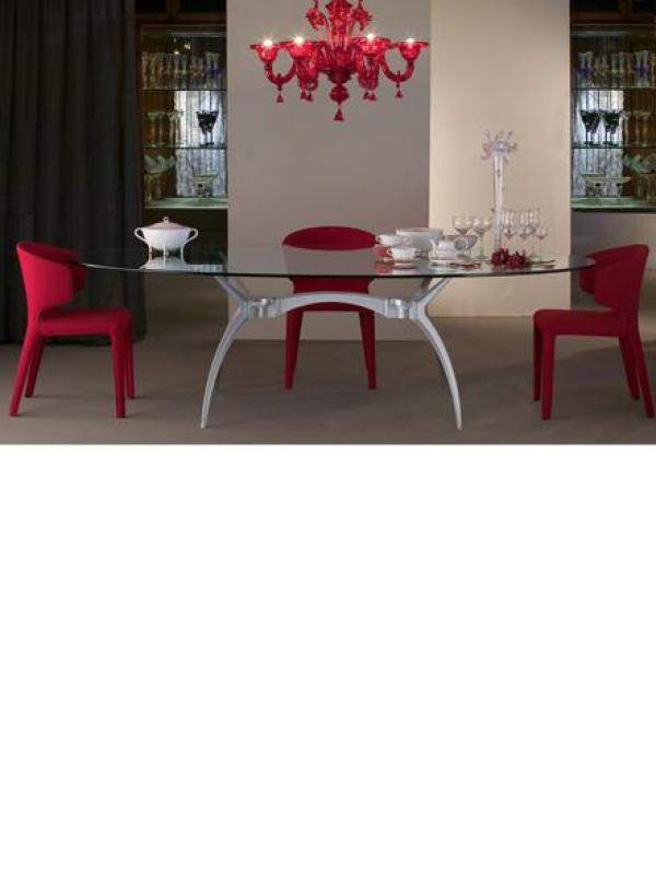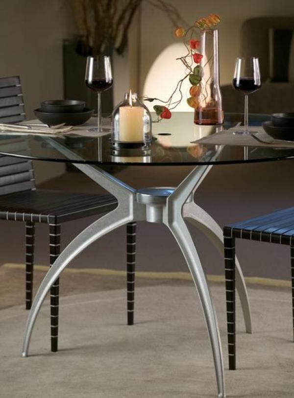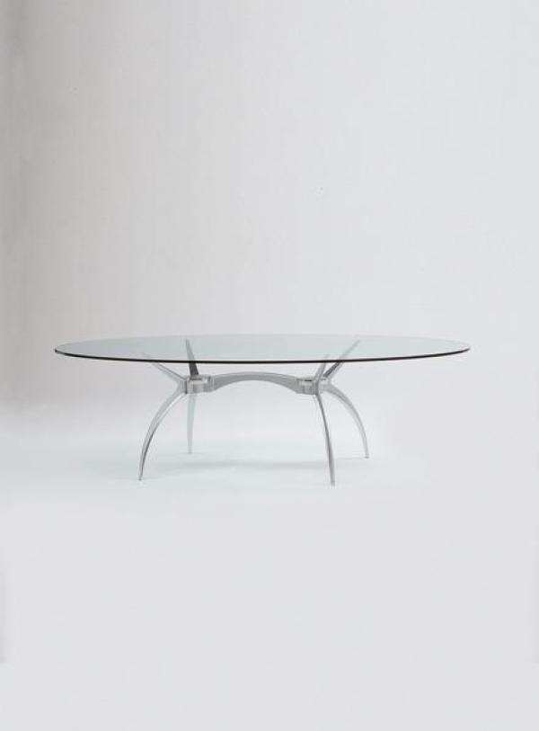 Aracnida tableA single design of an aluminium leg in two parts, one of which rests on the floor, while the other supports the top. The combination of three or more legs makes it possible to accommodate the different sizes and shapes of the top which comprise this extensive range of tables. Finishes Structure in cast aluminium, partially glossy polished and anodised brillant. Rectangular or elliptic glass top table available in transparent, matt butiral or with engraved star-shaped motif (12, 13 or 15mm). Launch : 1990