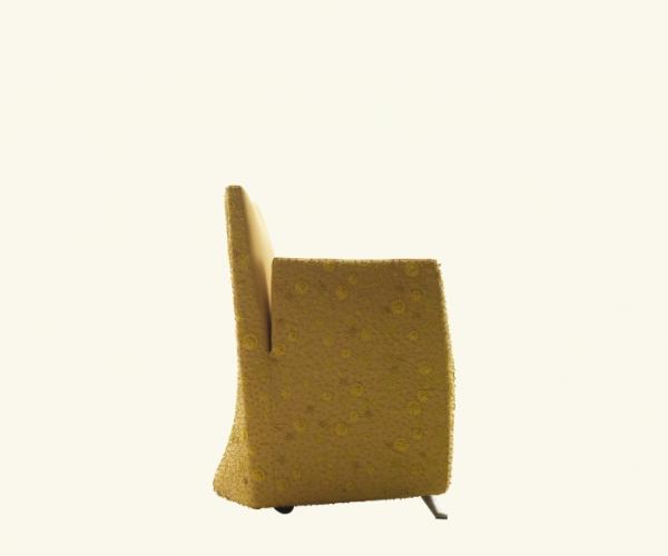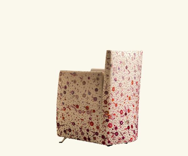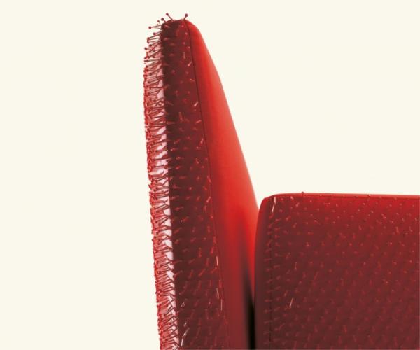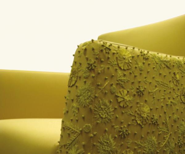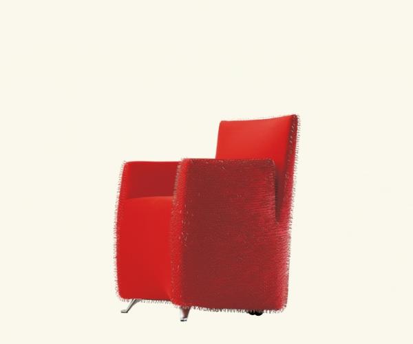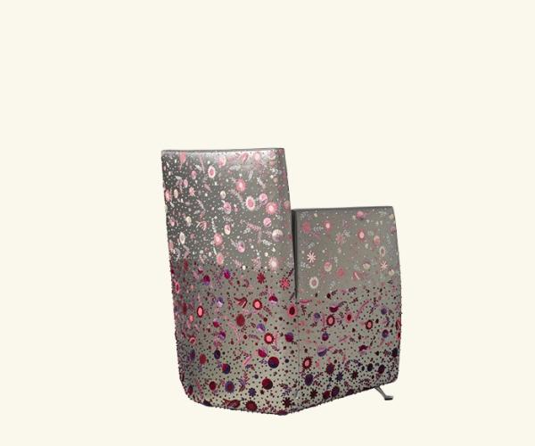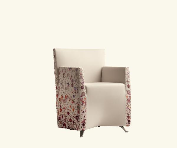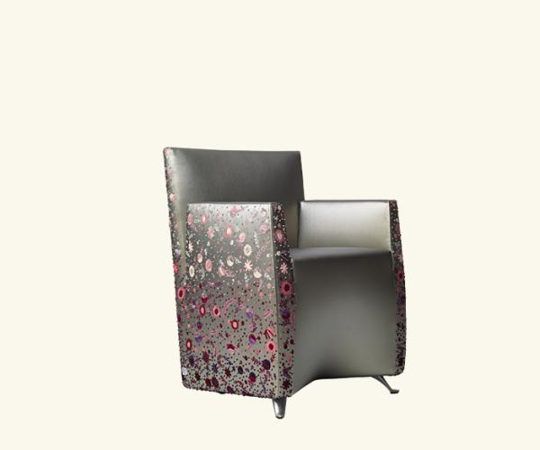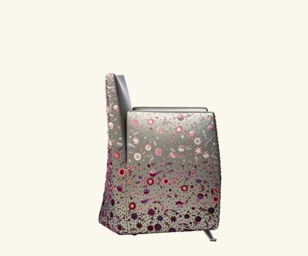 AuraArmchair with flexible backrest, covered in technical fabric decorated by Maurizio Galante, available in two decorations: aura, with small glass tubes and pearls to form an aura and aura fiorita, with floral embroidery. Made on the base of caprichair, it is available with fabric and decoration in four colours: white, lemon, red and black. Aura fiorita is also available in a version with multicolour floral embroidery on the base of white marsia, ivory or champagne sudden technical fabric.