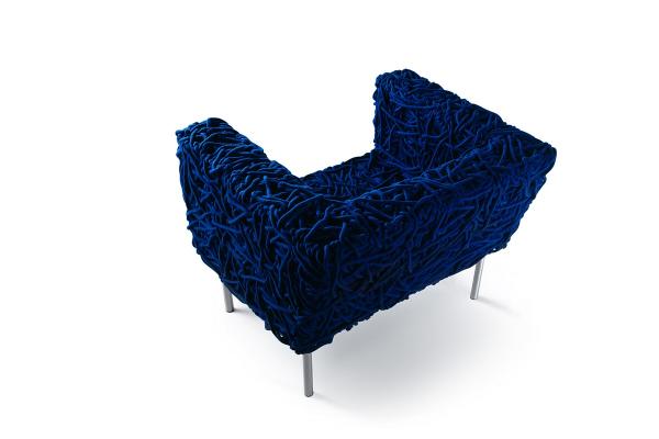 AzulThe rope is plaited round the box frame entirely by hand. Some 650 metres of special, cotton-clad acrylic rope are needed for each chair. The armchair is hand made in a skilful sequence, weaving 650 metres of special rope with an acrylic core covered in cotton. The irregular weave, built up by perfected manual skills over several days’ work, forms the padding and covers. Its metal frame is coated with epoxy powders. Launch : 1993-1998 Dimensions : w980 x d800 x h770mm |