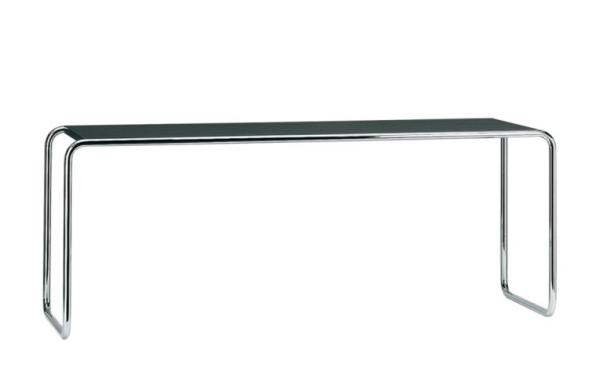 B 10"TUBULAR STEEL CLASSICS - ELEGANT SIDE TABLES B 10 During his time at the Bauhaus Marcel Breuer experimented with steel and tubular steel as materials by logically translating the principles of furniture design appropriate for the material involved from wood to this new material. The proximity to the Junkers plant in Dessau was of enormous advantage. Among his first designs are the nesting tables B 9 and shelves as well as side furniture (B 10, B 22). The Thonet catalog from 1930/31 included the complete program range. B 9 chairs were, for example, used in the cafeteria of Walter Gropius' Bauhaus building. Today, these elegant designs find their place in homes and the semi-public sector. B 10 side table, B 10/1 with additional shelf. Frames chrome-plated tubular steel, wooden parts in stained beech, lacquered or structured coating in various colors." |