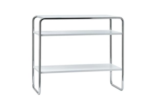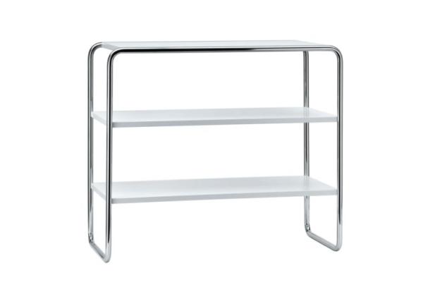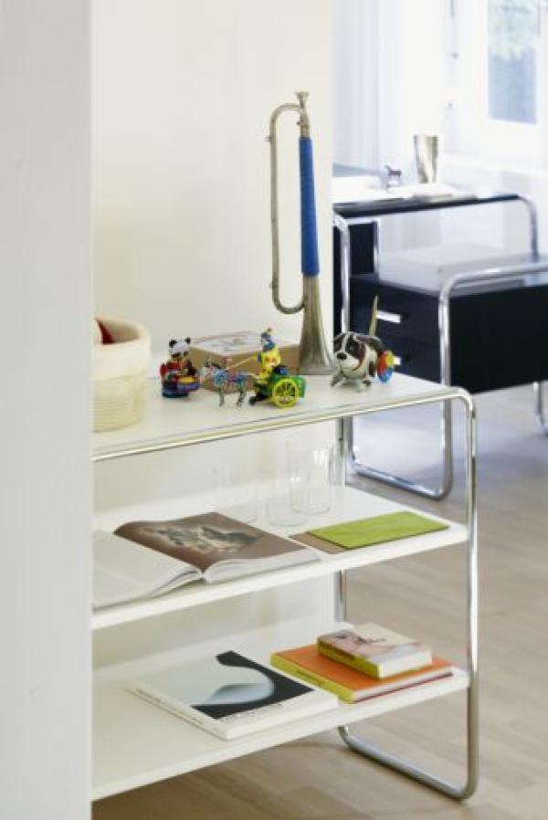 B 22"TUBULAR STEEL CLASSICS - ELEGANT SHELVES B 22 During his time at the Bauhaus Marcel Breuer experimented with steel and tubular steel as materials by logically translating the principles of furniture design appropriate for the material involved from wood to this new material. The proximity to the Junkers plant in Dessau was of enormous advantage. Among his first designs are the nesting tables B 9 and shelves as well as side furniture (B 10, B 22). The Thonet catalog from 1930/31 included the complete program range. B 9 chairs were, for example, used in the cafeteria of Walter Gropius' Bauhaus building. Today, these elegant designs find their place in homes and the semi-public sector. B 22 a Shelf with evenly distributed compartments, B 22 b with compartments at folder-height distance. Frames of both versions are pre-drilled, chrome-plated tubular steel, wooden parts in stained beech, lacquered or structured coating in various colors." |