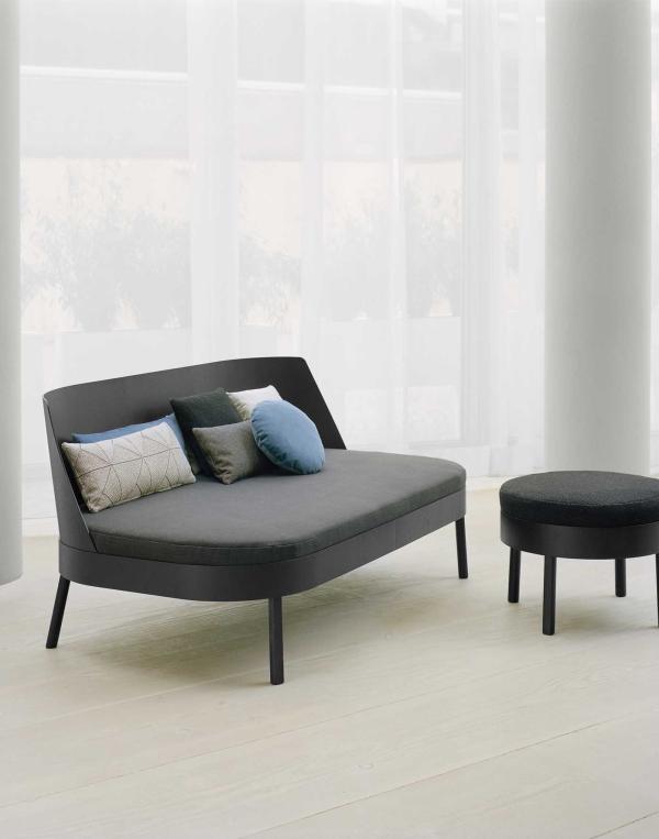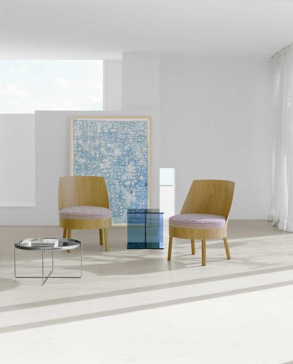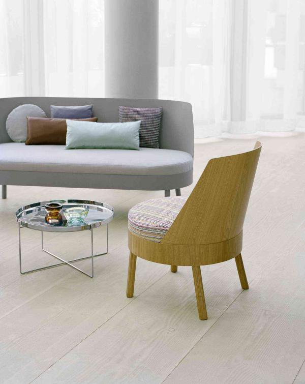BESSYThe lounge chair EC02 BESSY and the corresponding stool complete the product family around the sofa SF05 BESS. EC02 BESSY has a comfortable high back and round upholstered seat and is made from flexible oak- or walnut- veneered plywood, lacquered. Reminiscent of a cocktail-lounger, the space-saving EC02 BESSY is suitable for private use as well as for contract use especially in hotel lobbies and bars. For more comfort and style, this lounge chair can be complemented with the cushion CU06 NIMA. Optionally, EC02 BESSY is also available as a stool without back rest. EC02 BESSY can be complemented with the sofa SF05 BESS. The seat height is 400 mm (15 ¾ inch) and its seating depths 560 mm (22 inch). The upholstered seat is not fixed. EC02 is delivered as one piece. |