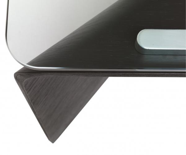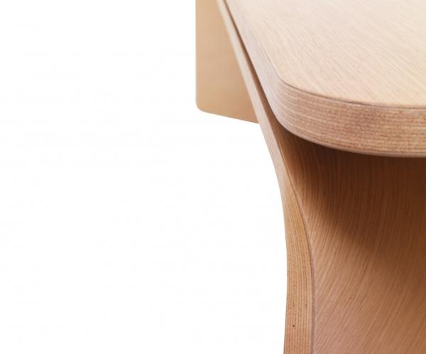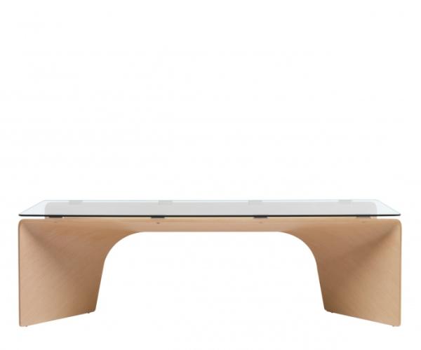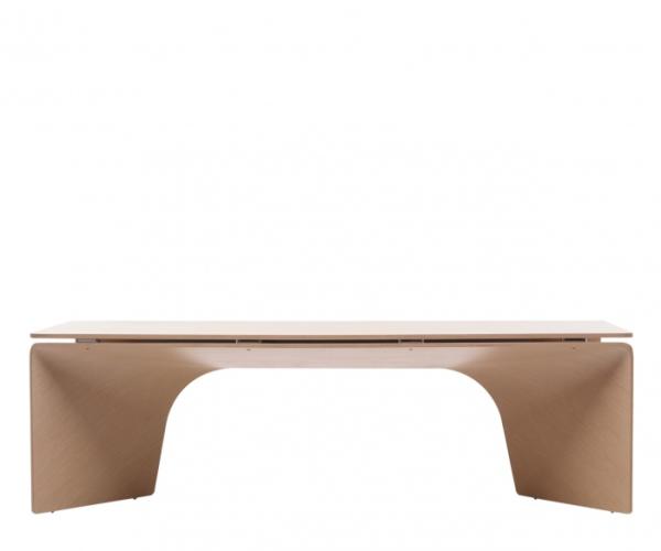 BigbendTable composed of three elements: two identical planes of curved multi-plywood are matched with complex curves and support the top of multi-plywood in the same finish or in 12mm tempered glass. Bigbend is available in two sizes, with an oak veneer surface in bleached white or open-pore asphalt black, or lacquered in white, burgundy or black.