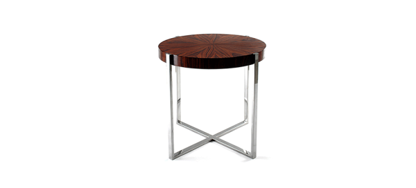 BoardwayThis table sober and truly elegant makes a great contrast in a room full of wood veneers. This modern piece of furniture can be a compliment to your living room and can revamp refined interiors like a contemporary bedroom. Broadway side table is handcrafted, made from rosewood, palisander or other type of wood veneers. The tabletop is finished in lacquer, available in subtle veneer silver or gold leaf. The feet are in stainless steel. Dimensions : DIAMETER 630 x HEIGHT 590mm |