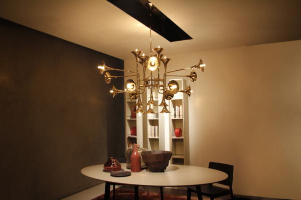 The apparent levity reminds us a wind instrument bathed in gold, which brings us intoa smooth atmosphere. Indeed, its structure made in brass is gently covered by a golden mantle, ideal to adorn your living room or dining room, turning it an absolutely unique room. Botti suspension lamp will mark a ‘before’ and ‘after’at your home.