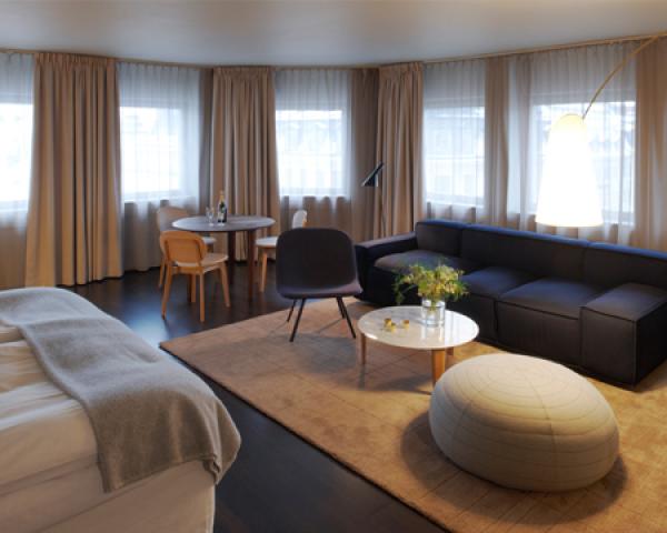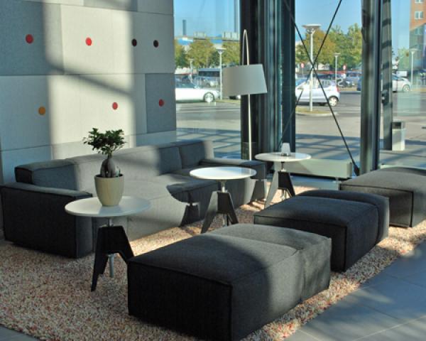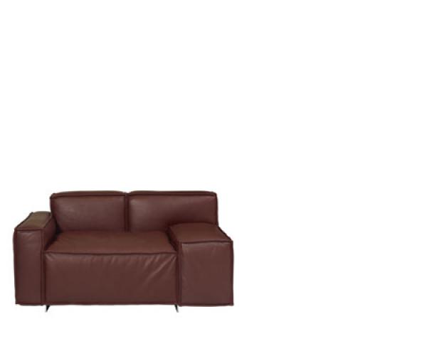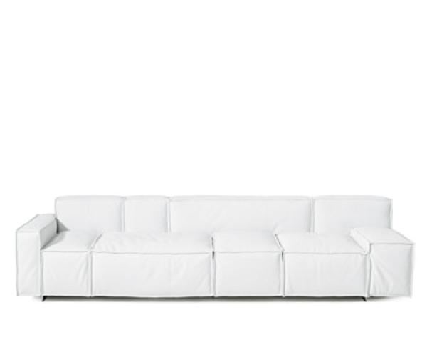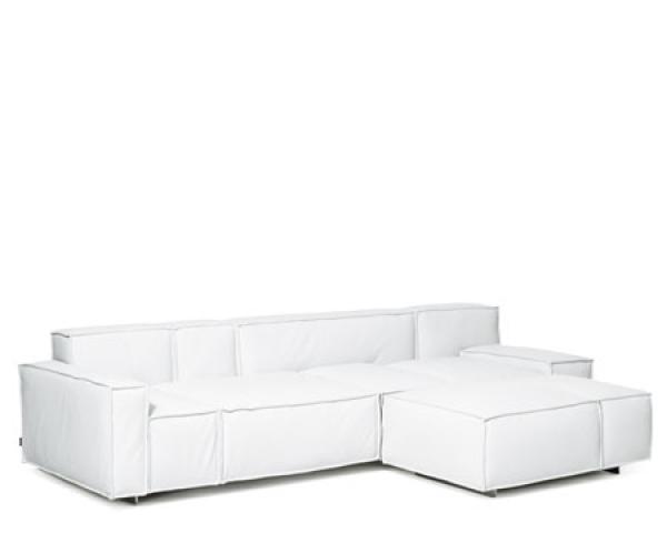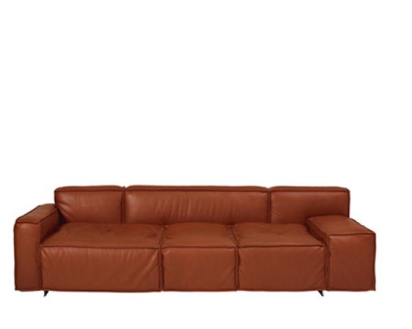 "Boxplay sofas in four different sizes, and an ottoman. Frame in solid wood, high resilience foam and cases with Latex pins. Sled base in brushed steel.
