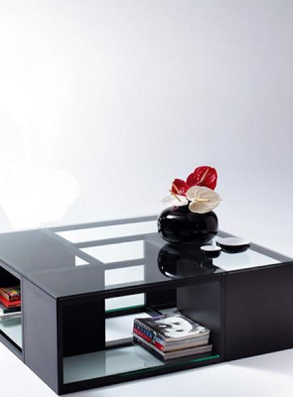 Burguesa tableTable composed of modules of 40 x 80 x H.40cm. Structure in solid beech wood of 3 x 3cm. Sides in MDF, 30mm thickness. Both in black matt-lacquered(M10) or in white matt-lacquered (M04). Lower top in transparent glass of 6mm, thickness. Upper tops in transparent glass of 8mm, of several measures, which will be used according to the quantity of modules of the composition to be covered. Separating and union pieces between modules in black plastic when the table is in black, or colourless if the table is white. Launch : 1980