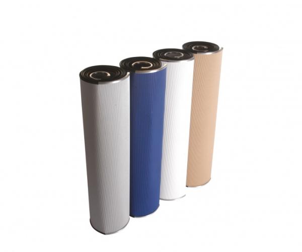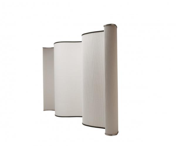 CartoonsScreen with free-standing structure in corrugated paper-board extracted from pure cellulose, completely recyclable and without polluting by-products in the colours white, light brown, blue and silver. Upper and lower edge in technopolymer in matt black. Terminal stiffening components in brushed die-cast aluminium.