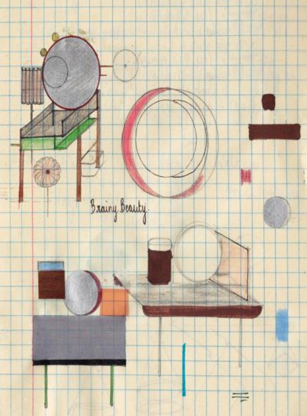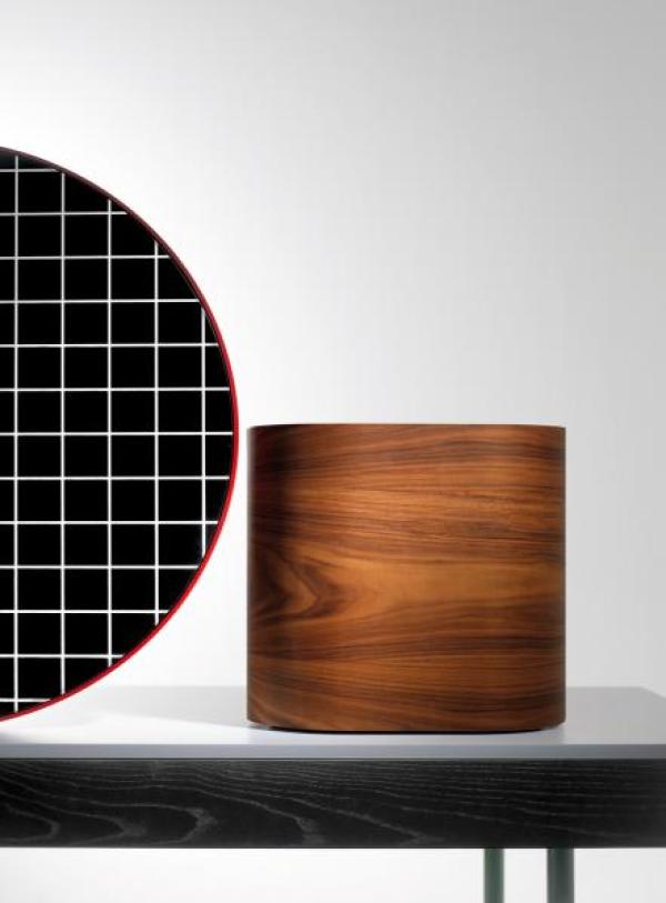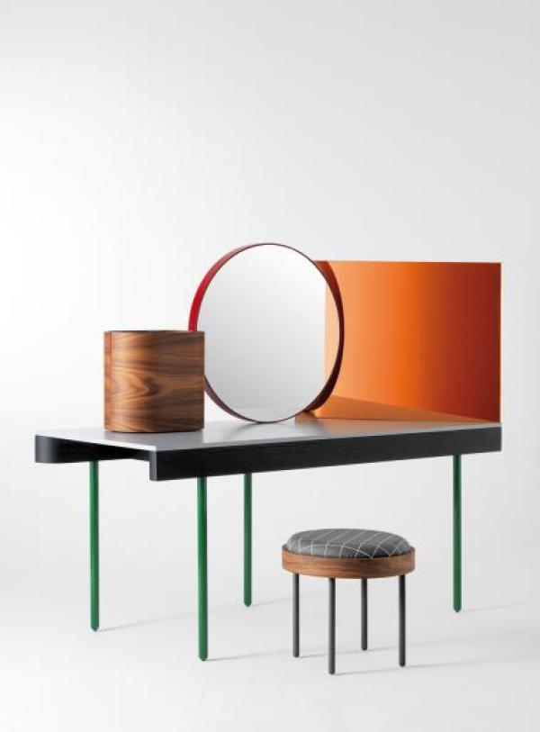 Dressing table: Structure in solid ash fitted out in black matte. The table legs are tubular steel, painted in a brilliant green. The solid, compact table top (mixed natural minerals and polymers) is in a light grey. There is a central, frontal faced mirror, which is composed of a steel frame, painted in red. The back of the mirror is black MDF painted with a graphic pattern in brillant white. The side mirror has a filtered rose colour. The jewellery box in plywood (rosewood). Launch : 2012