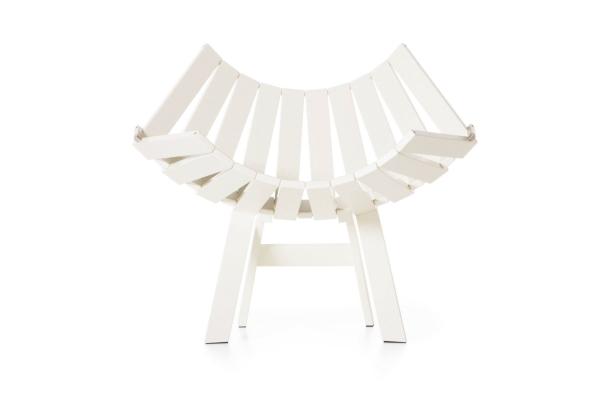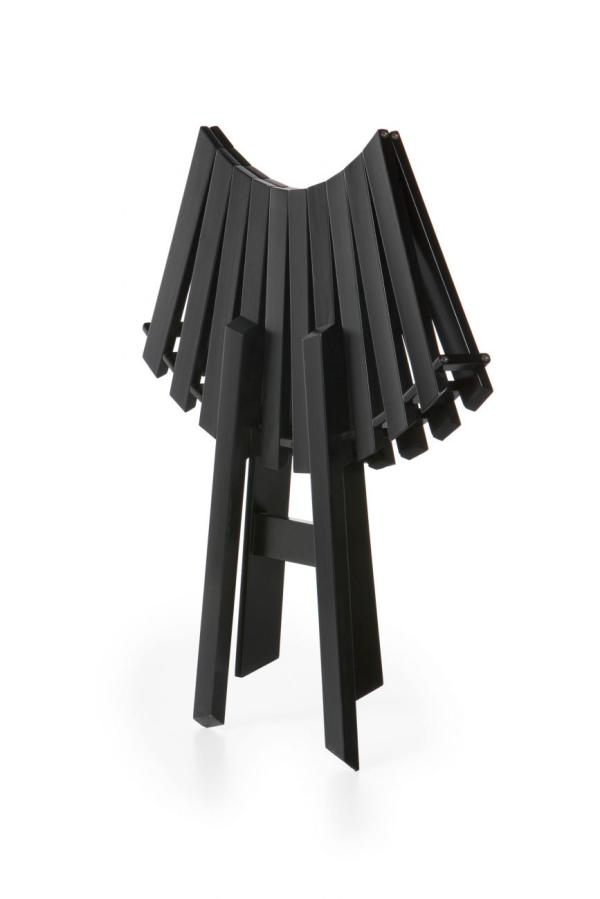 Clip ChairWhilst strolling around a Bulgarian market, a small, foldable basket caught our attention. Single slats were beaded on ropes to form 2 hinged surfaces, which could be transformed into a curved 3 dimensional object. We improved this stunning mechanism, both technically and visually, to create a foldable lounge chair - the ‘Clip Chair’. When open, it’s straight identical slats form a spacious seating space of supreme comfort. This simple design not only makes the chair highly practical, but also creates a sculptural object of outstanding aesthetic value, whether folded or open. Launch : 2006 Dimensions :
