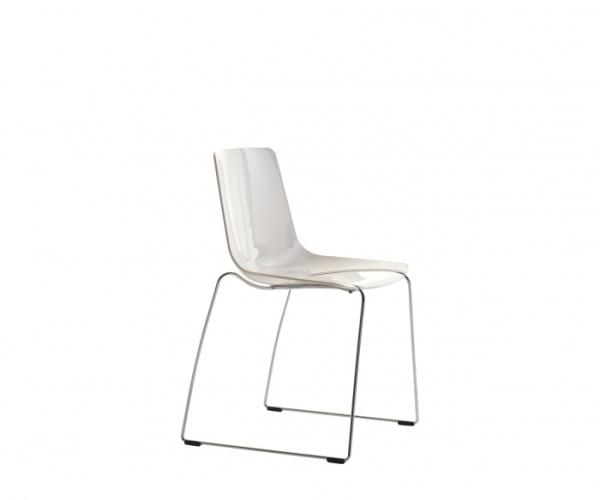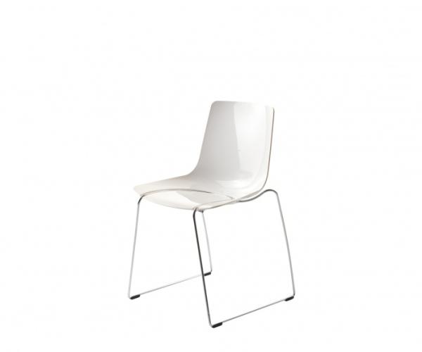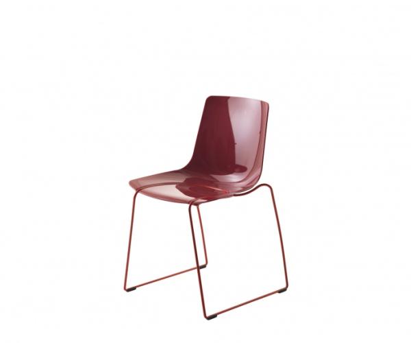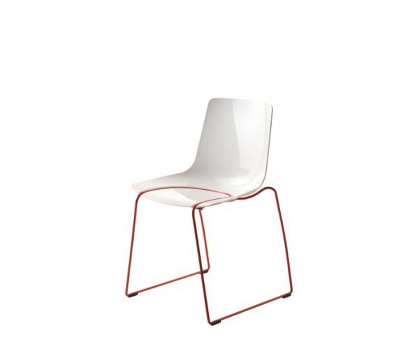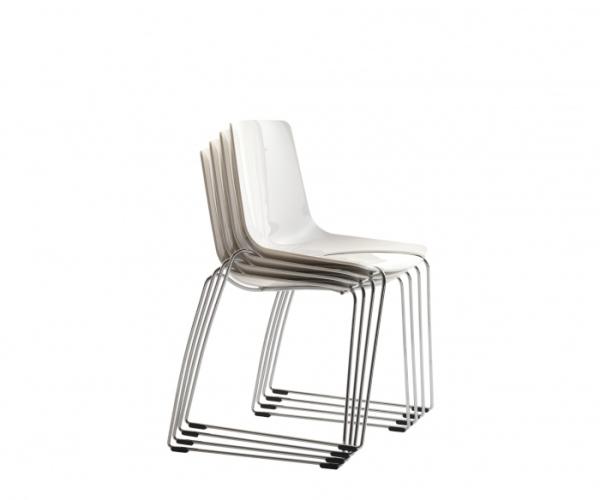 CliptStackable chair with injected polished nylon shell, available in white, black or burgundy red and steel-rod base in stainless, chrome or painted in white, red or black. The shell and the base are assembled without screws thanks to an exclusive mechanism that makes it possible to open the structure and separate it from the shell without requiring any tool.