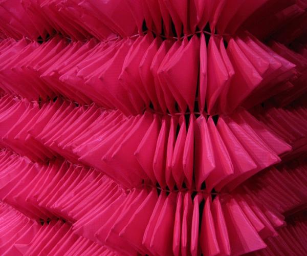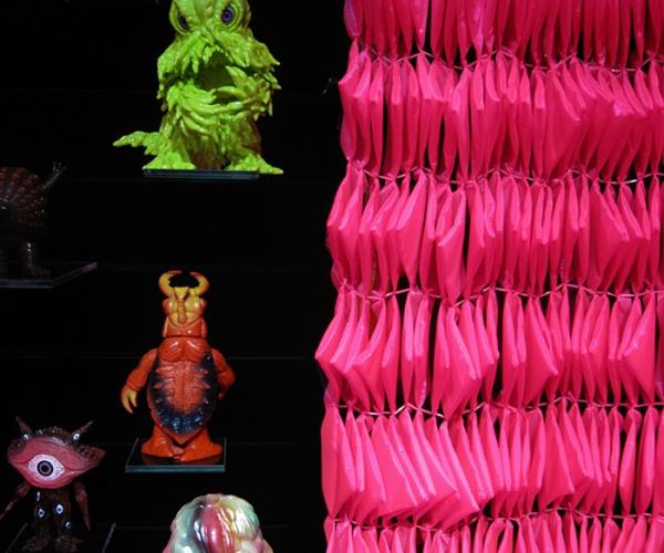 "Cabinet with blockboard and mdf structure magenta fluo or black lacquered, structural back panel with millings for shelves and slats covered by black velvet, three dimensions of shelves in extra-clear tempered glass and curtains in magenta or black technical fabric.