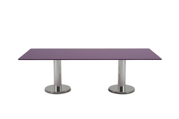 CromaSeries of tables which top is realised in tempered glass – 15 mm thick – natural or extra white painted in the colours of the collection. Top is available in arious sizes and shapes. Cylindrical bases in aluminium are available both matt or painted in the colours of the collection. Polished bases available on the 50 cm diam. version only. Two heights available. Launch : 2005 Dimensions :
