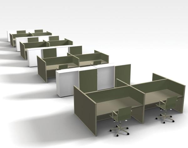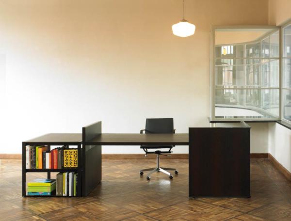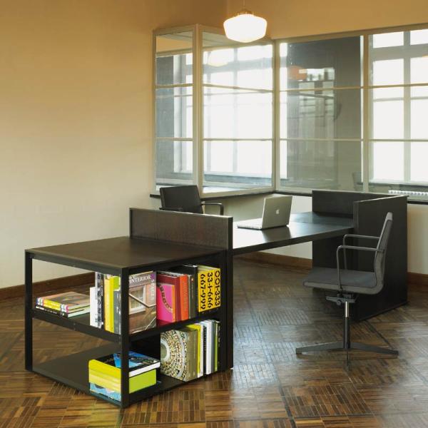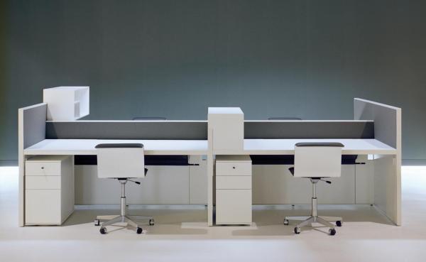 "Van Duysen managed to scale his architecture down to a compact piece of furniture, built up with various lacquered panels, complemented with fabrics. The raised panels create an intimate workspace. The smooth edges are realised in Corian. Freestanding drawer units, sliding door cabinets and meeting tables complete the range.