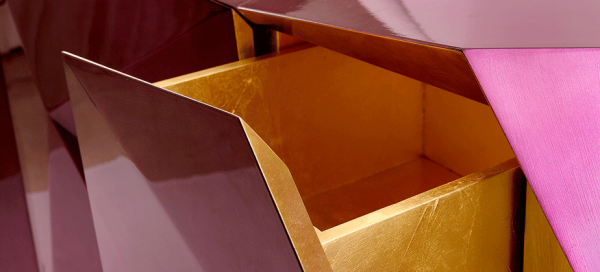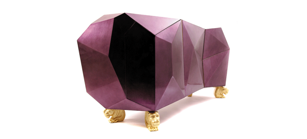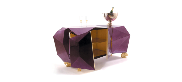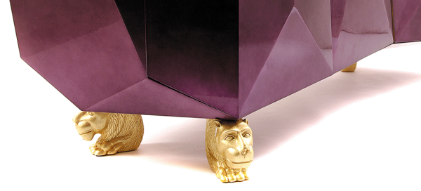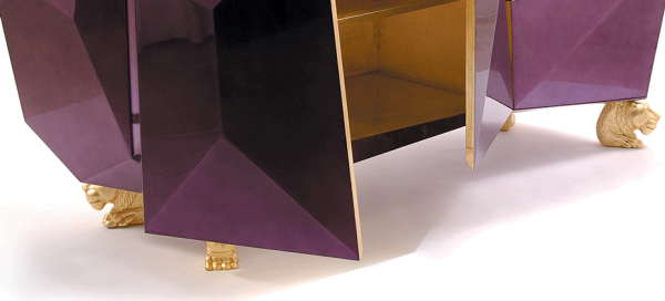 DiamondDesigned to be the faceted crown jewel to play on BL’s reputation as furniture jewelers and justify the title, this opulent object of desire features two highly sculptured doors leading to a gold leaf interior with shelving and two drawers. Inspired by Gothic furniture of the Romantic period with its ability to harness the power of the imagination to envision and escape, and its strong style with presence and strength. The exterior of this fanciful piece is covered in silver leaf finished with a luxurious shade of translucent amethyst high gloss varnish. The whimsical lion’s head feet are intricately hand carved from mahogany and completed with a gold leaf. Dimensions : WIDTH 1800 x DEPTH 600 x HEIGHT 830mm |