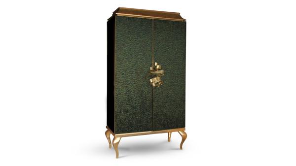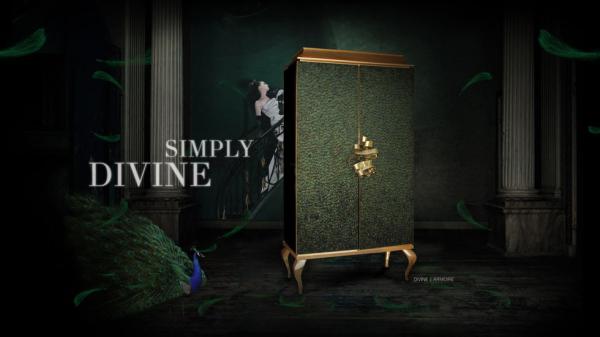 Divine | ArmoireThis utterly desirable double door pagoda top armoire is covered in delicate iridescent peacock feathers each individually placed. An exquisite metal ribbon opens the doors to a lavish interior graced with four antique mirror drawers & two adjustable glass shelves. Body finished in high gloss black lacquer with base and top covered in gold leaf.