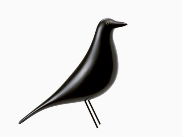 Eames House BirdCharles and Ray Eames augmented the interior “collage” of the Eames House with numerous objects brought back from their extensive travels. The figure of a black wooden bird — evidently one of their most prized objects of American folk art — has stood in the centre of their living room for over fifty years. Also seen as an accessory in many of the Eameses’ photographs. Materials : Solid alder, black lacquer finish, steel wire.