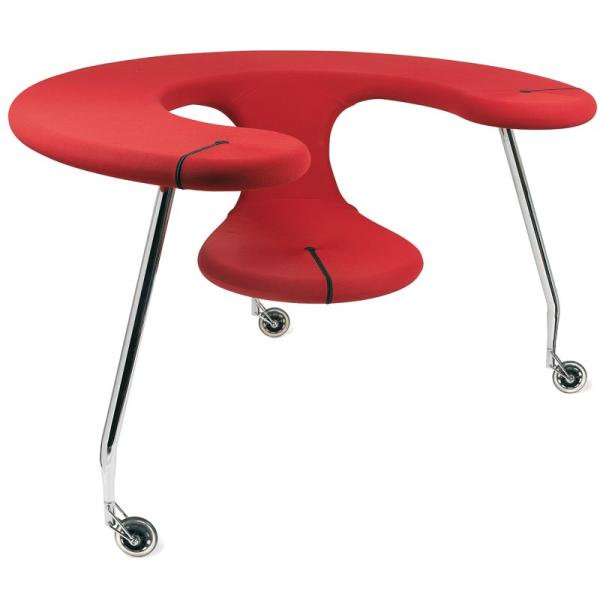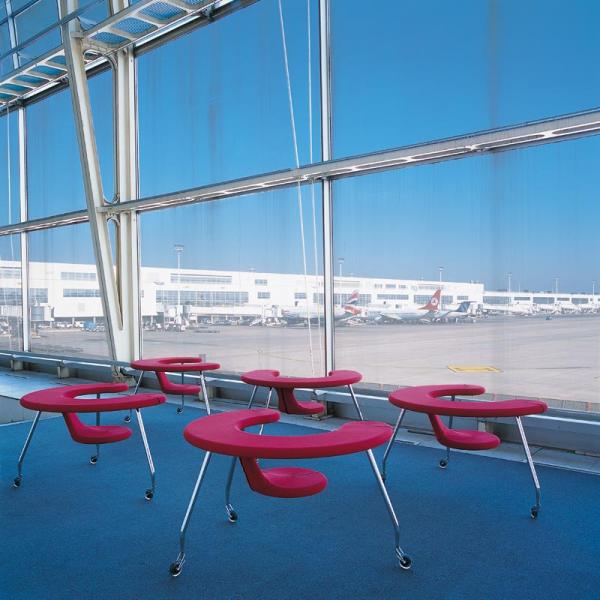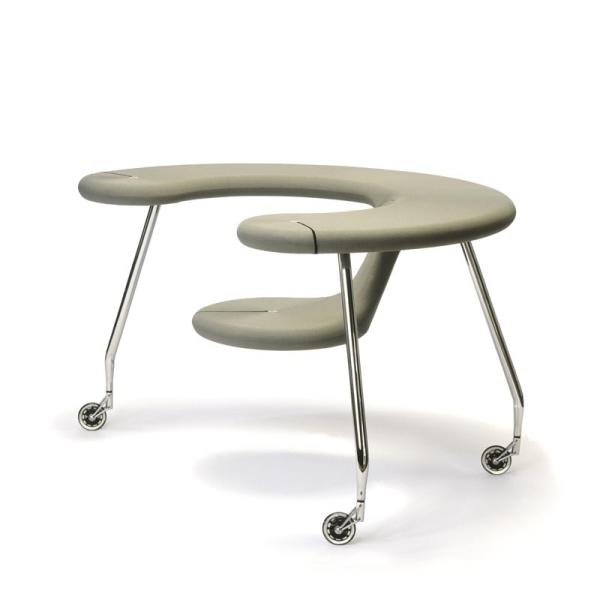 "For the Carte Blanche collection, Venlet created a mobile desk-seat. Often confronted with unconfortable seating in waiting areas at airports, Venlet wanted to unite the function of seating and working for a while (laptop, mobile,…) in one product. The chair has an integrated seat and back (or armrest), supported by chrome or lacquered (Ral 7021) legs. The chair is available on wheels or glides.