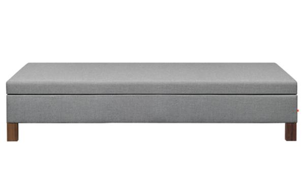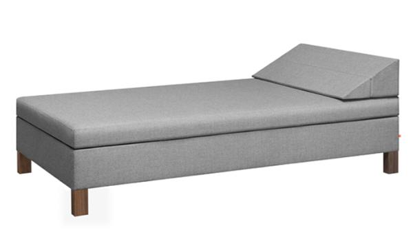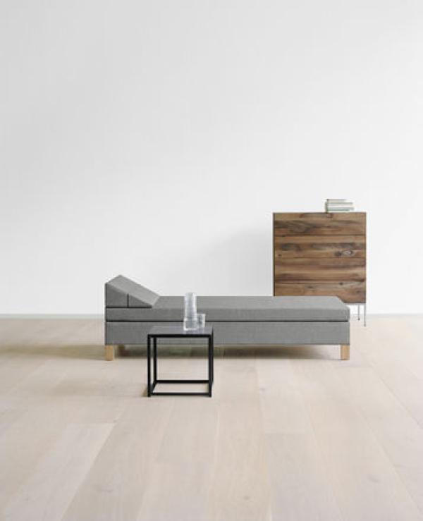 FK11 SENCKENBERGDesigned in 1952 as part of the furnishing for the Johann Wolfgang Goethe-University in Frankfurt am Main, the FK11 SENCKENBERG daybed is an extension of Ferdinand Kramer’s elegant and enduring upholstered furniture series from 1926 with the sofa FK09 WESTHAUSEN and armchair FK10 WEISSENHOF. The wedge-shaped, upholstered headrest can be folded up into a rectangular armrest and accounts for the versatile charm of this daybed. Superior wave springs ensure seating or lying comfort. Available with solid oak or walnut legs, the daybed is delivered as one piece. |