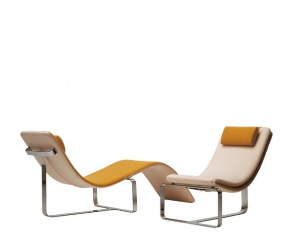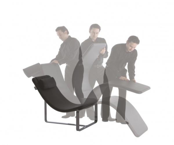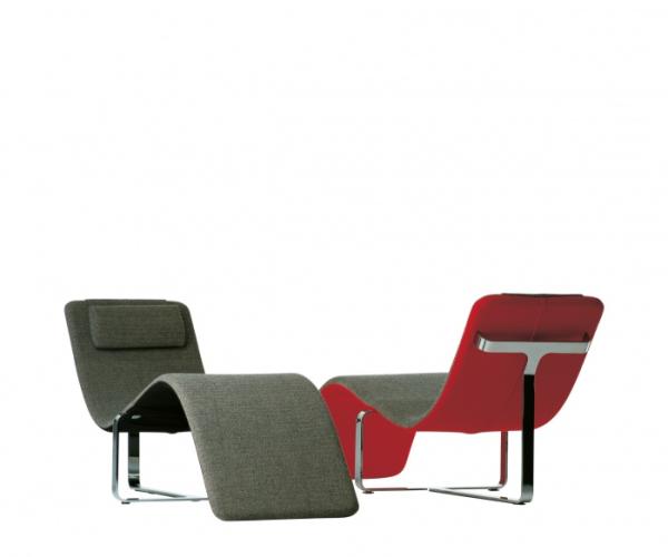 FliptConvertible armchair/chaise-longue with steel structure, foamed polyurethane seat and chromed steel. A mechanism makes it possible to flip the seat forward, opening up and thus doubling the length of the chair. Removable cover in fabric, synthetic material, leather, available in solid colours or in a two-colour combination, with the possible combination of different fabrics/leathers of similar thickness.