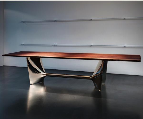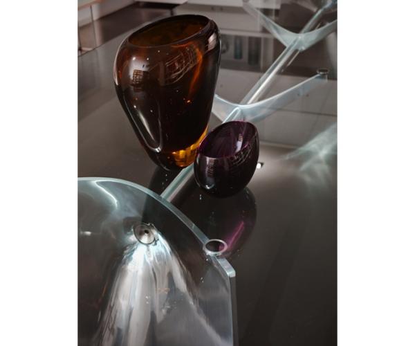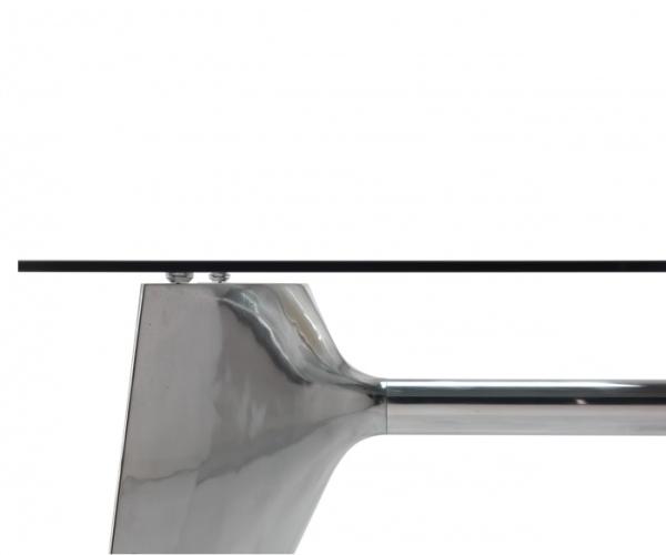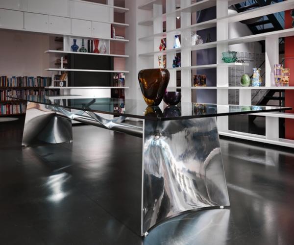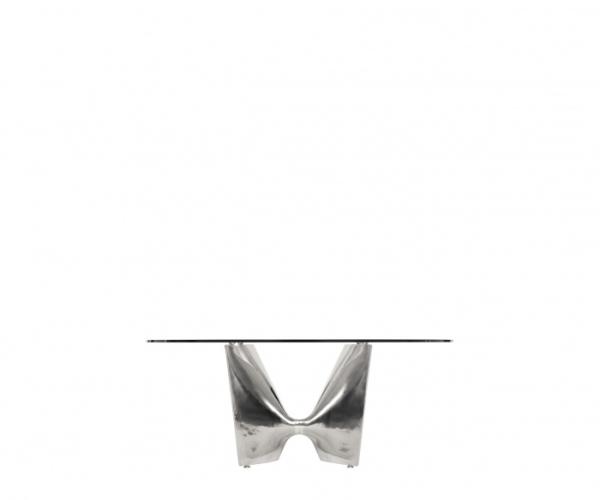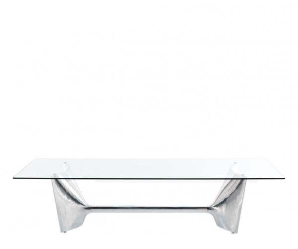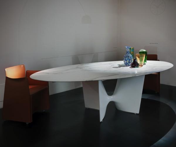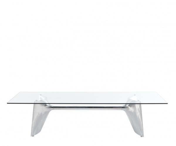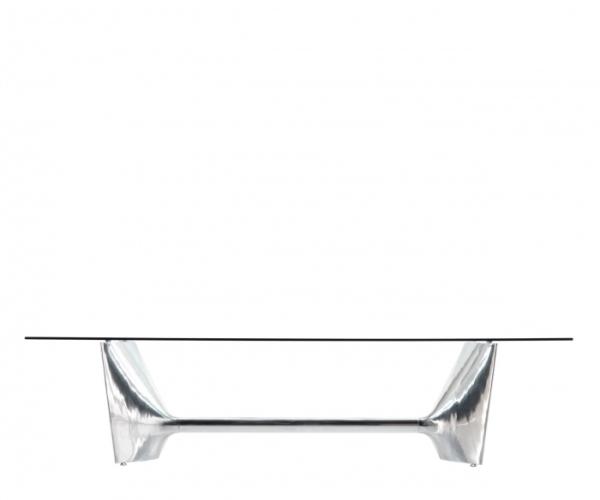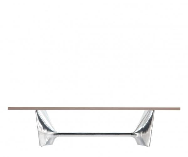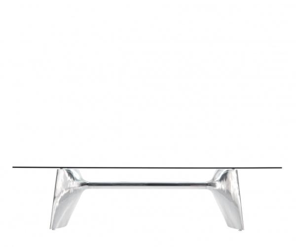 "Table with aluminium base composed by two shell-cast pediments spanned by an extruded elliptical beam. The large rectangular tops are available in tempered glass or blockboard in MDF. The base structure can be turned upside-down and used with the central beam in a high position. The round tempered glass top versions are available with a base without the connecting beam.