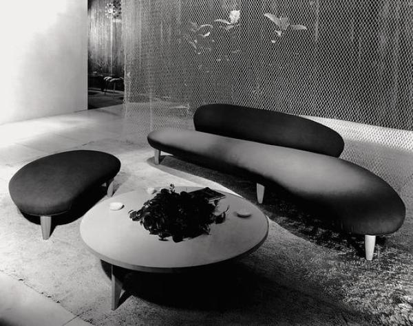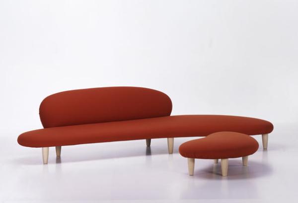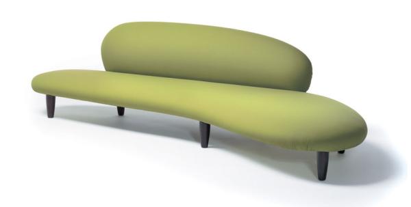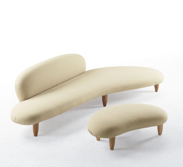 Freeform Sofa & OttomanTwo examples of Noguchi's predilection for sculptural lines are his Freeform Sofa and Ottoman, the shapes of which are reminiscent of river pebbles. Noguchi himself described his design as "soft rock". Thanks to its organic shape and the natural tones of its upholstery fabric the sofa has a light, elegant feel, despite its voluminous form. Vitra Design Museum Collection. wooden beech frame, classic upholstery, removable fabric cover, legs natural maple or stained walnut colour.