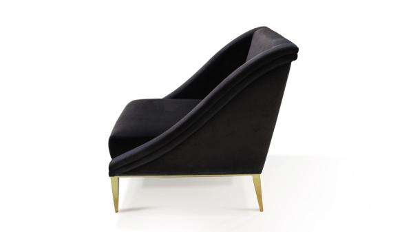 Geisha | ChairDesigned to perform in a matter that indulges the eyes, the Geisha‘s curves grace a room with the extravagance and poise of a Kyoto Geisha. Fully upholstered tight back chair with soft tufting on the cushions. A polished brass band wraps the piece leading to a modern & sleek polished brass foot.