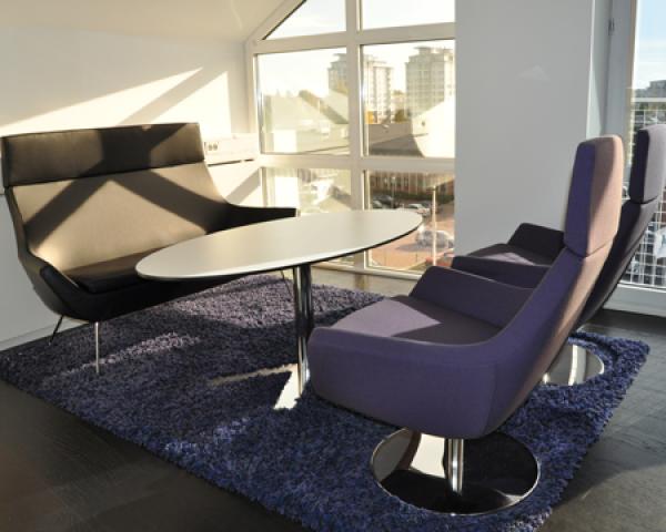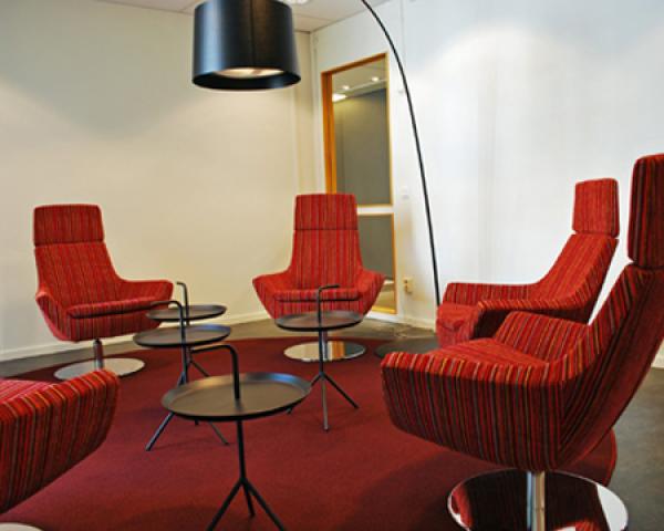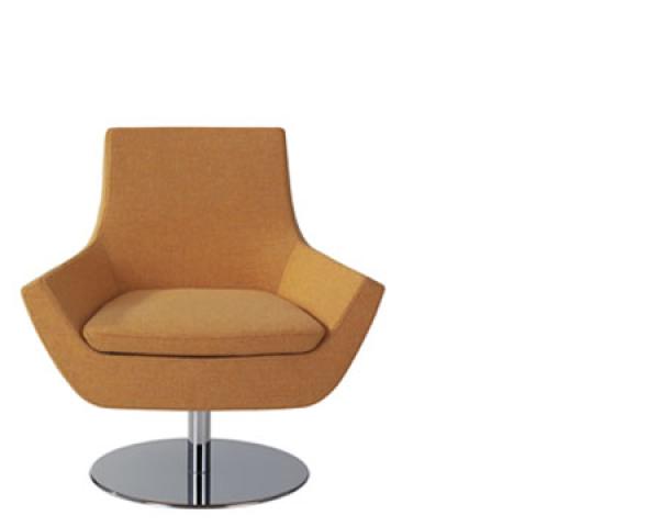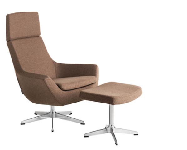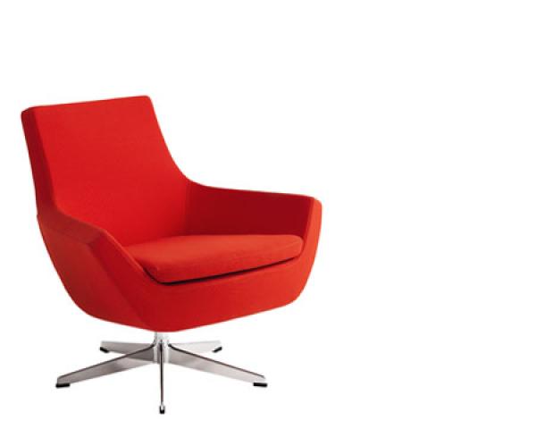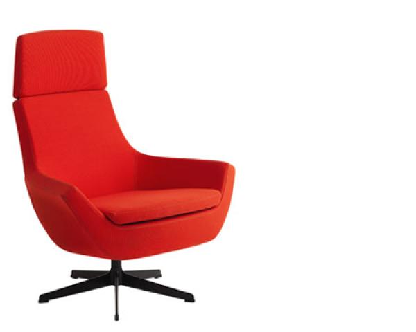 "Swivel chair with high- or low back, foot stool. Also available as easy chair. Frame: Steel tubing. 5-star (4-star on foot stool) swivel base in recycled aluminium, clear lacquered, white or black lacquered. Or steel disc swivel base lacquered white, black or chrome finish.Option: Rocking mechanism on the swivel chairs.