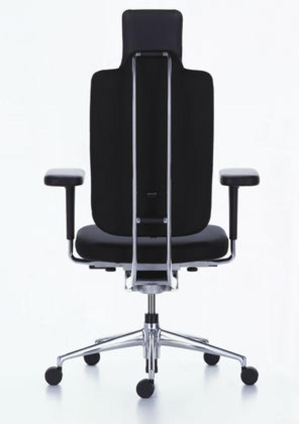 HeadLine Management Chair solves this problem: The flexible, elongated backrest is suspended from the frame at the critical points of the lower back and neck by means of articulated joints. In the upright position, most of the supportive function is focused on the lumbar zone. When the sitter leans back, the shoulders sink into the back panel and the upper backrest extension tilts forward to support the head. This prevents muscle strain in the neck and shoulder areas. Contrary to conventional office chairs, in which users find themselves gazing at the ceiling in the reclined position, Headline maintains a horizontal line of sight with the sitter's eyes directed toward the computer monitor.