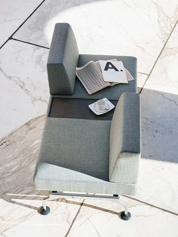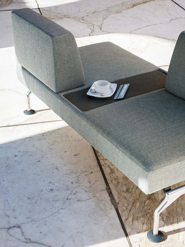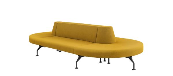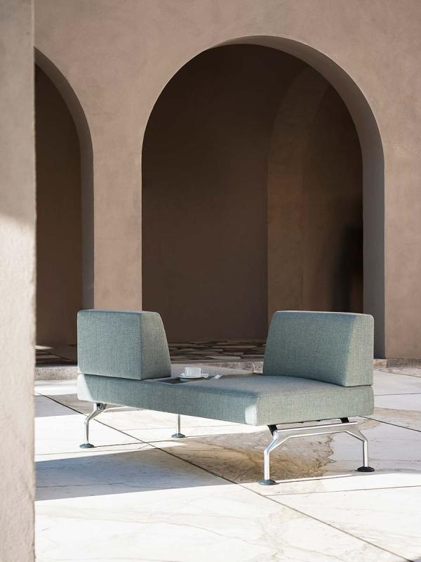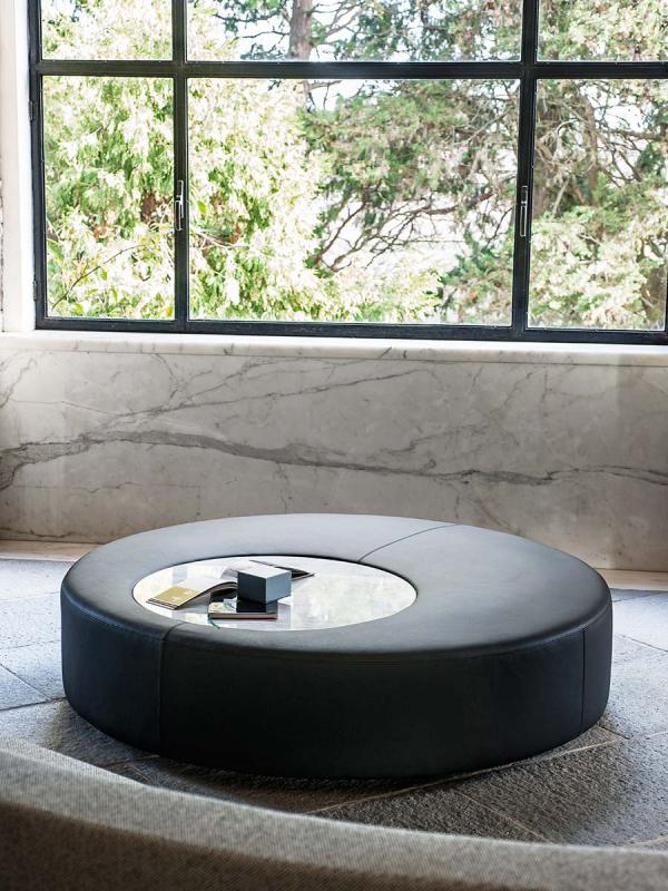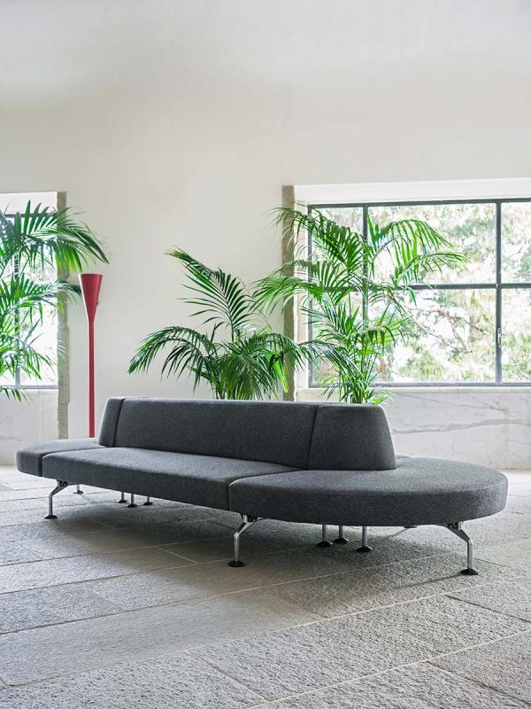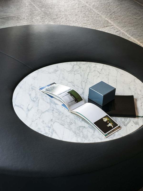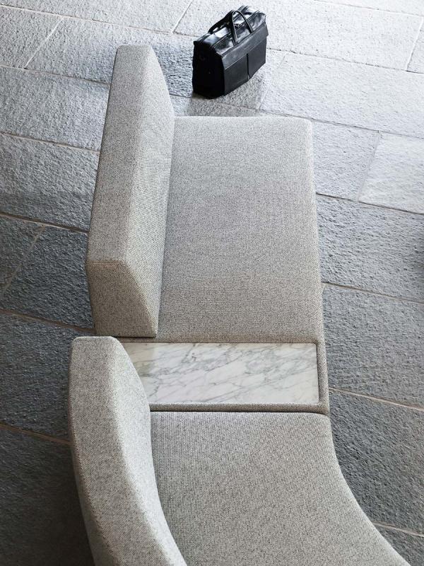 Intercity is a modular system for creating spaces tailored to any room and need. The wide choice of base modules includes upholstered elements with or without back, both straight and curved. The straight seats, also with integrated side table in matte Carrara marble or Basaltina, can be combined as preferred to compose different solutions, even the most unusual ones, such as those made possible by the module with S-shaped back which creates a double-sided seat, or by the modules with “face-to-face” seats. Arch or island compositions can be created thanks to the curved modules. The seating system also includes a round pouf, with or without integrated top in marble.