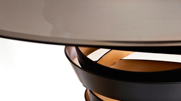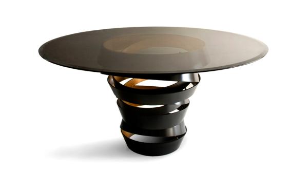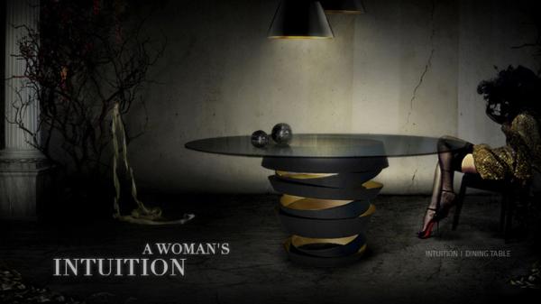 Intuition | Dining TableThe two tone metal ribbon of the Intuition dining table evokes the mysterious and divine feminine instinct. Carefree & unexpected swirls are guided by emotions and desires. Matt black metal swirl with metallic interior & glass top. Without this, there is nothing.
