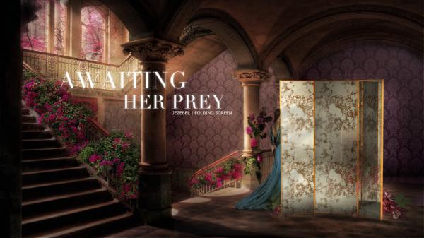 Jezebel | ScreenFrom the antique fashioned mirrors to the delicate detailed patterns, this temptress will have more than her fair share of lovers shielding themselves behind her screen. The enticing artwork is balanced against slender golden pillars casting the object as a standing temptress awaiting her prey.