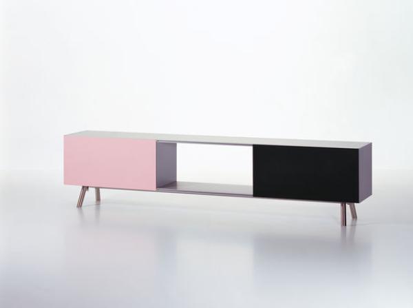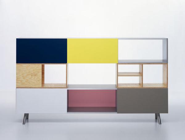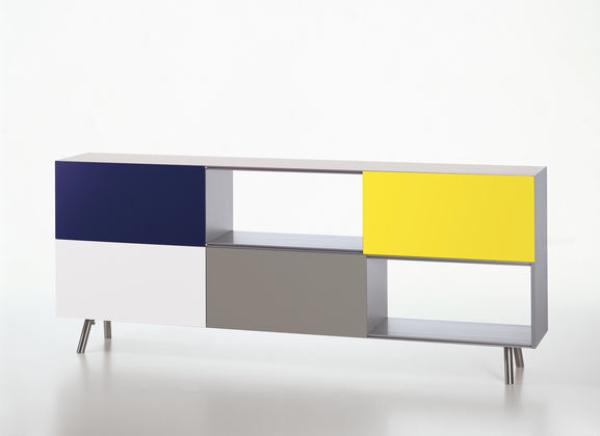 KastA key theme in the oeuvre of Maarten Van Severen is storage furniture, be it shelves, cupboards or sideboards. The design for Kast, which Van Severen worked on during the last few months of his life, can be considered the quintessence of his exploration of the subject. Kast is a storage unit that is modular in structure, the base version of which is a sideboard. Supplemented by two simple wooden crates and a further basic module, a shelf/wall cupboard combination arises. Van Severen paid special attention to the colour for the sliding doors, which not only emphasise Kast’s elegant and yet seemingly classical proportions, but also give it a fresh and optimistic sense. Materials : Tubular stainless steel legs, individually height adjustable. Shelves made of extruded eloxy aluminium profiles. Side walls made of powder-coated MDF. Maritime pine laminate with lacquering for a natural grain feel. Sliding doors in pink, dark green, bronze-grey, bright white, dark blue and sulphur yellow powder-coated sheet aluminium.