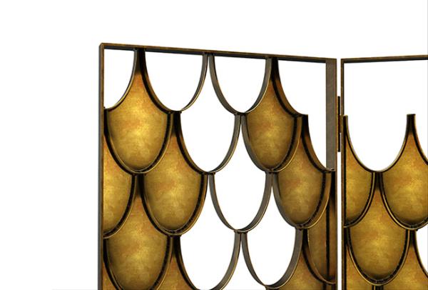 Koi ScreenKOI carp is a recurring symbol of Japanese culture, highly appreciated by its decorative purposes, not only in water gardens but also in Irezumi practice or, most commonly, in tattoos. Its natural colour mutations reveal their capacity to adapt, just like the KOI screen that you can use to create a better sense of space division in your ambiences. The KOI scales that compose the panels of the screen shine and reflect – on its brass surface – the sun caught throughout the clear water. KOI and the Japanese word for love or affection are homopho- nes, making the carp also a symbol of love and friendship. |