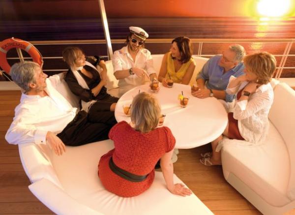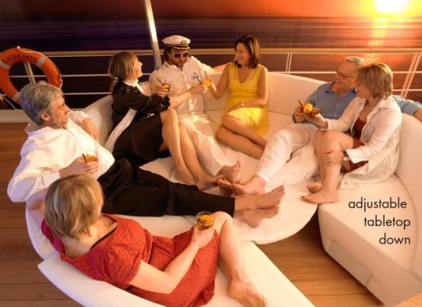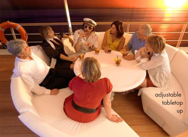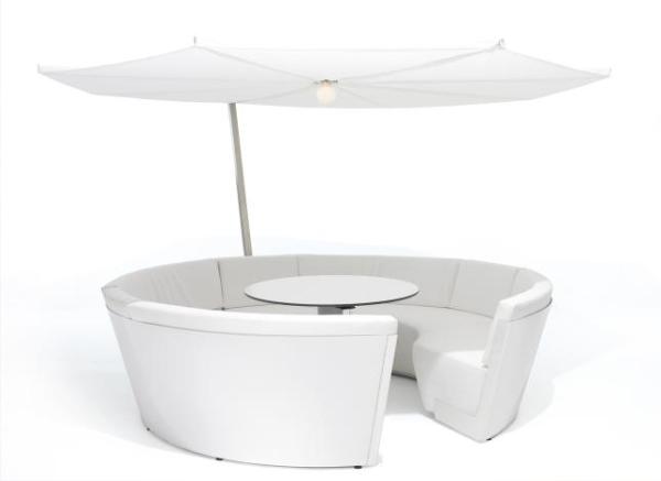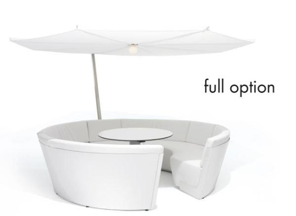 Kosmos' refined looks makes it also suitable for indoor use. In addition to the synthetic leather version, which does not only provide excellent seating comfort, but also the long lifespan typical of maritime products, the range also comprises versions with fabric and leather cushions. Other variants are also possible: with or without a table, with a fixed or an adjustable table, with or without a parasol, with or without integrated lighting, and an ample choice of colours for the parasol and the cushions. In short, Kosmos is probably the most customizable product of the meanwhile quite extensive Extremis range.