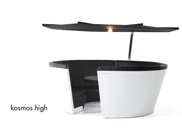 · Kosmos has its very own Kosmos parasol: An ingenious design that offers excellent wind resistance (wind force 6 on the Beaufort scale), hangs low enough to provide lots of shade, is positioned next to the table and seat combination, and opens as a fan.